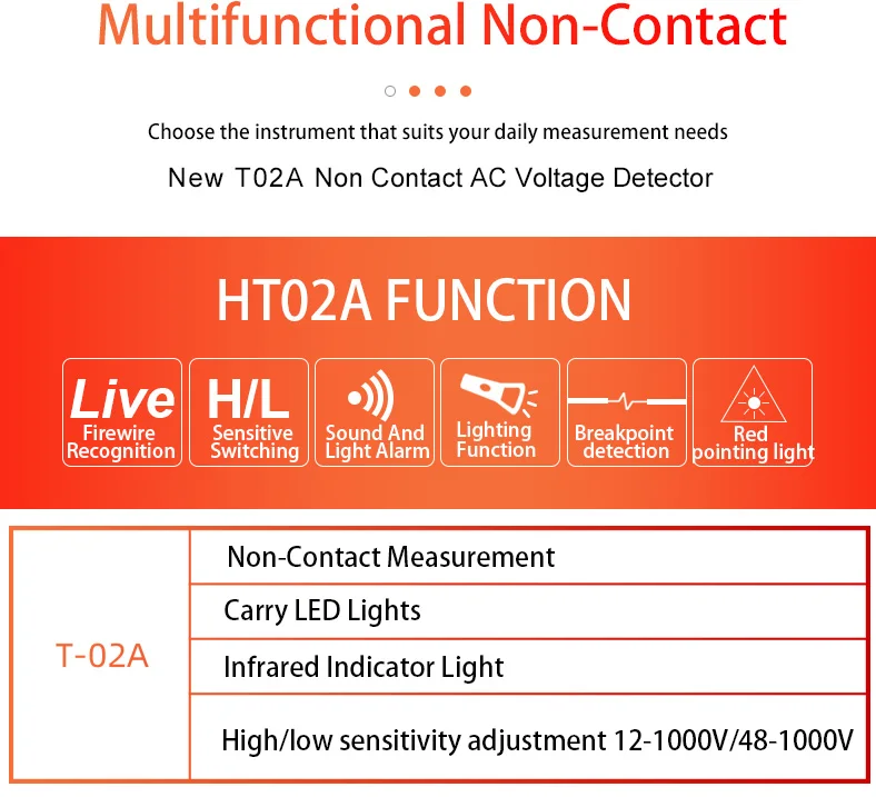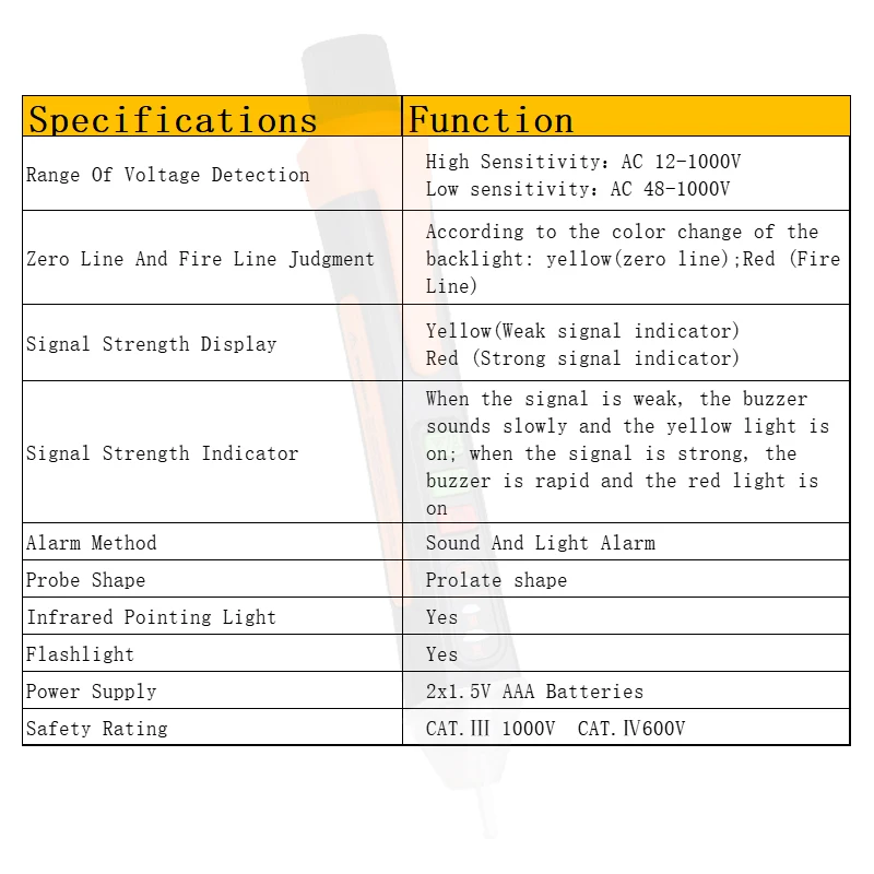 1. Диапазон обнаружения напряжения: Высокая чувствительность: 12-1000 В переменного тока; Низкая чувствительность: 48-1000 В переменного тока