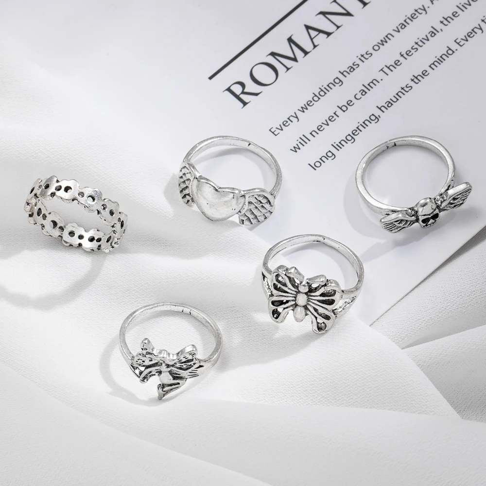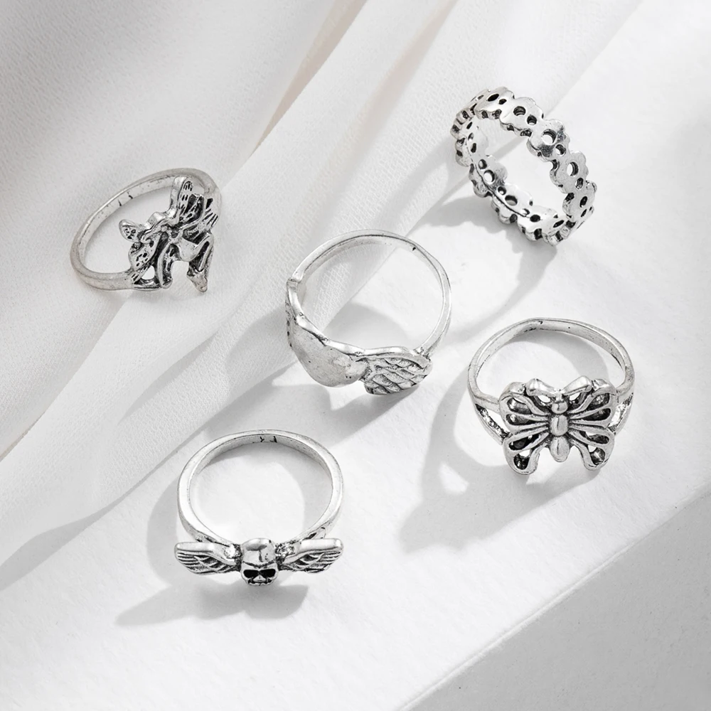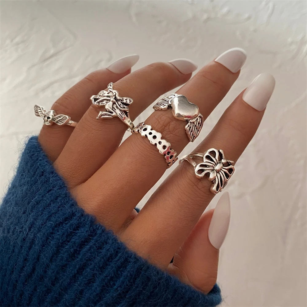 FAMSHIN винтажное серебряное кольцо с крыльями ангела для женщин, стимпанк, сердце, бабочка, кольцо с черепом, комплекты для вечеринок, готические украшения в стиле панк, 2021
