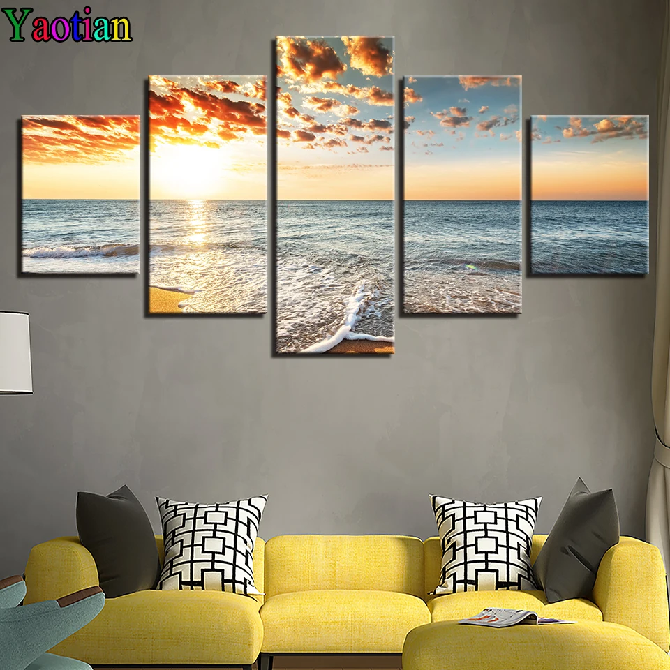 5 панельных алмазных вышивок, закат, пейзаж, морской пляж, алмазная живопись, вышивка крестиком, мозаика, полноразмерный дисплей, 5D Декор