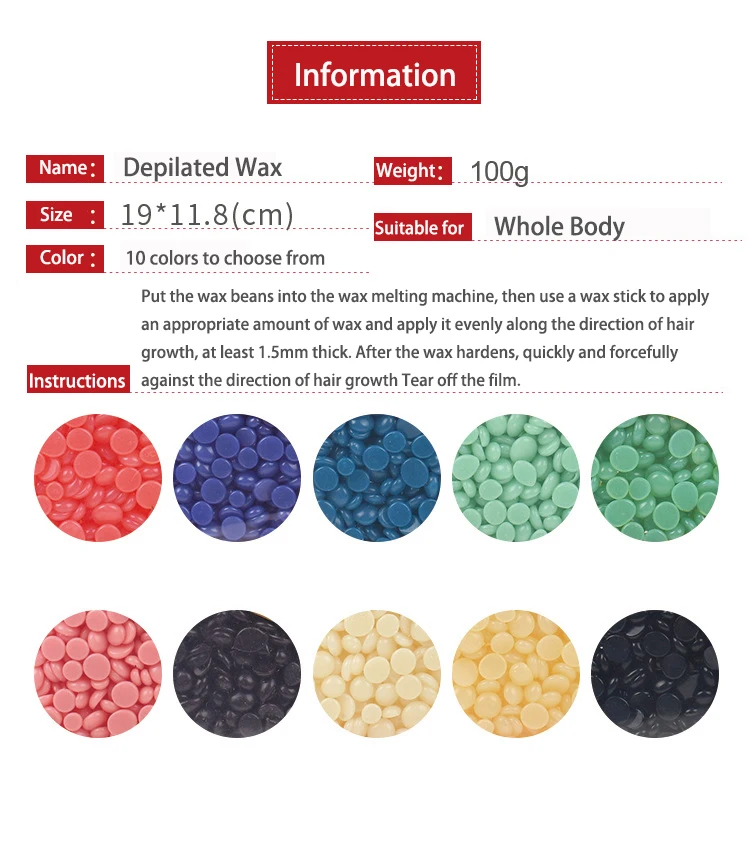 -Дозировка: 100 г восковых бобов может, вероятно, удалить волосы на двух руках или одной ноге. Пожалуйста, определите количество товаров, приобретенных в соответствии с вашим объемом использования