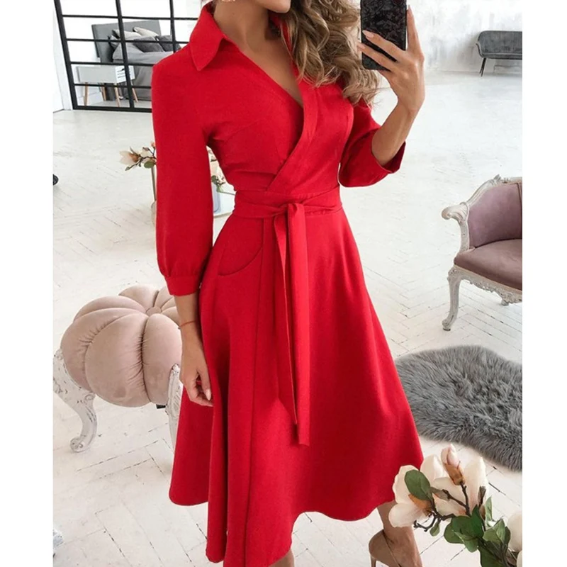 Женское платье с юбкой средней длины, платье с V-образным вырезом и...
