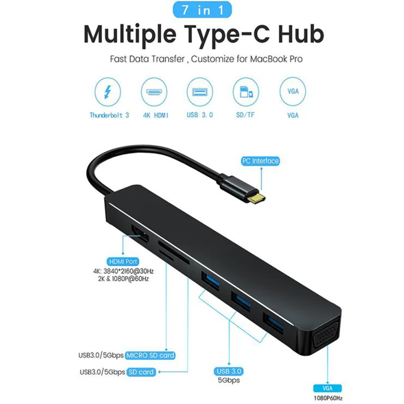 Разветвитель USB Type-C для Macbook Pro, док-станция для ноутбука, адаптер VGA, SD, TF, Thunderbolt 3 PD, 4K HDMI