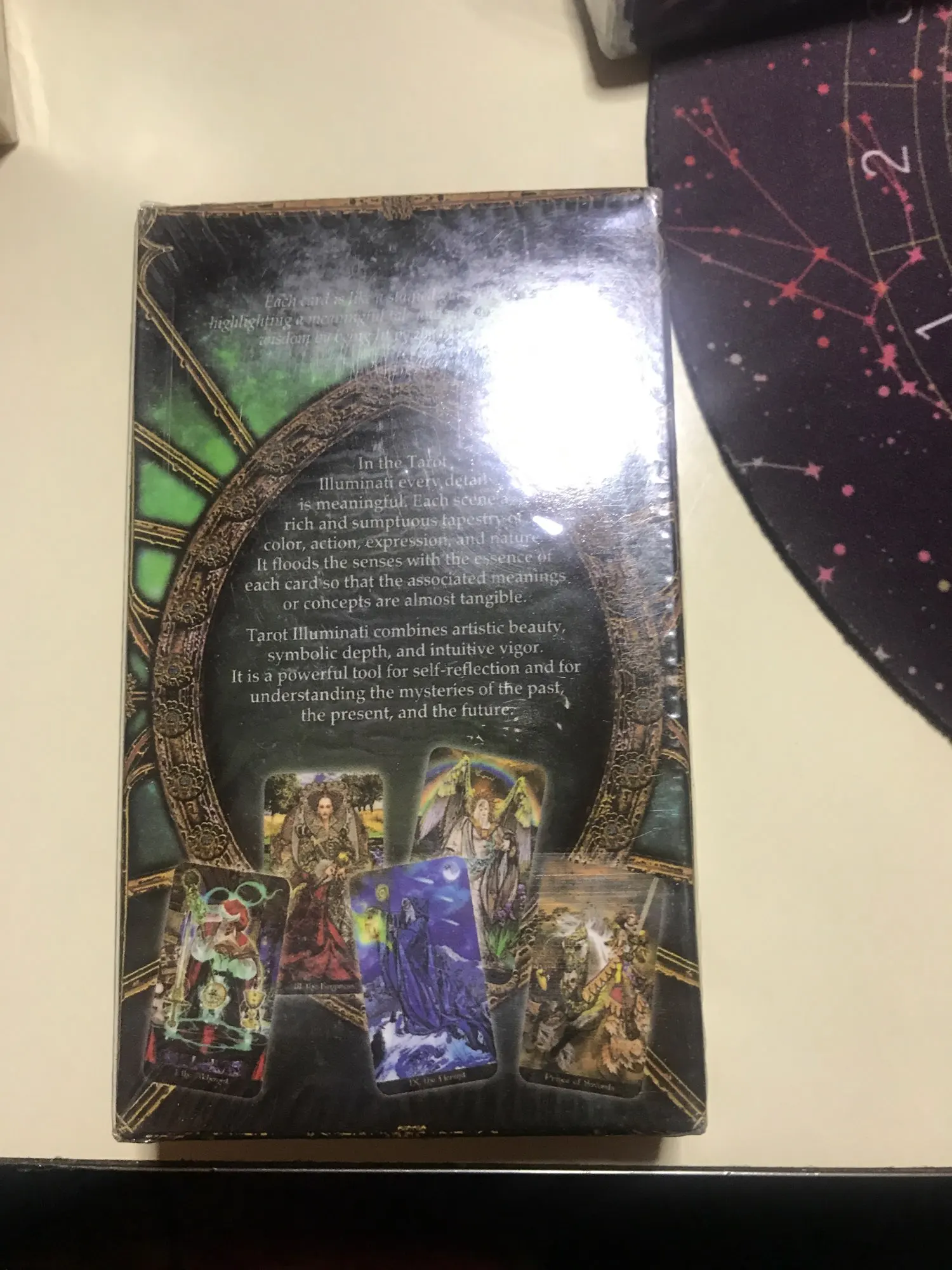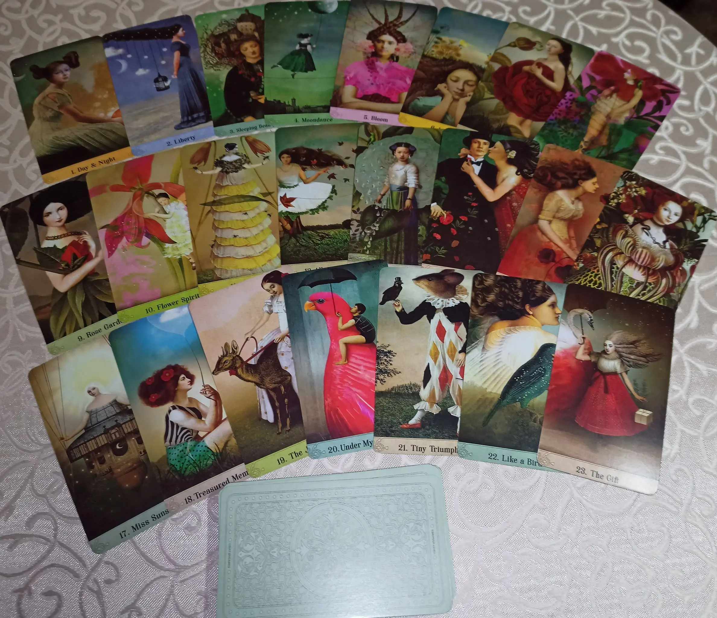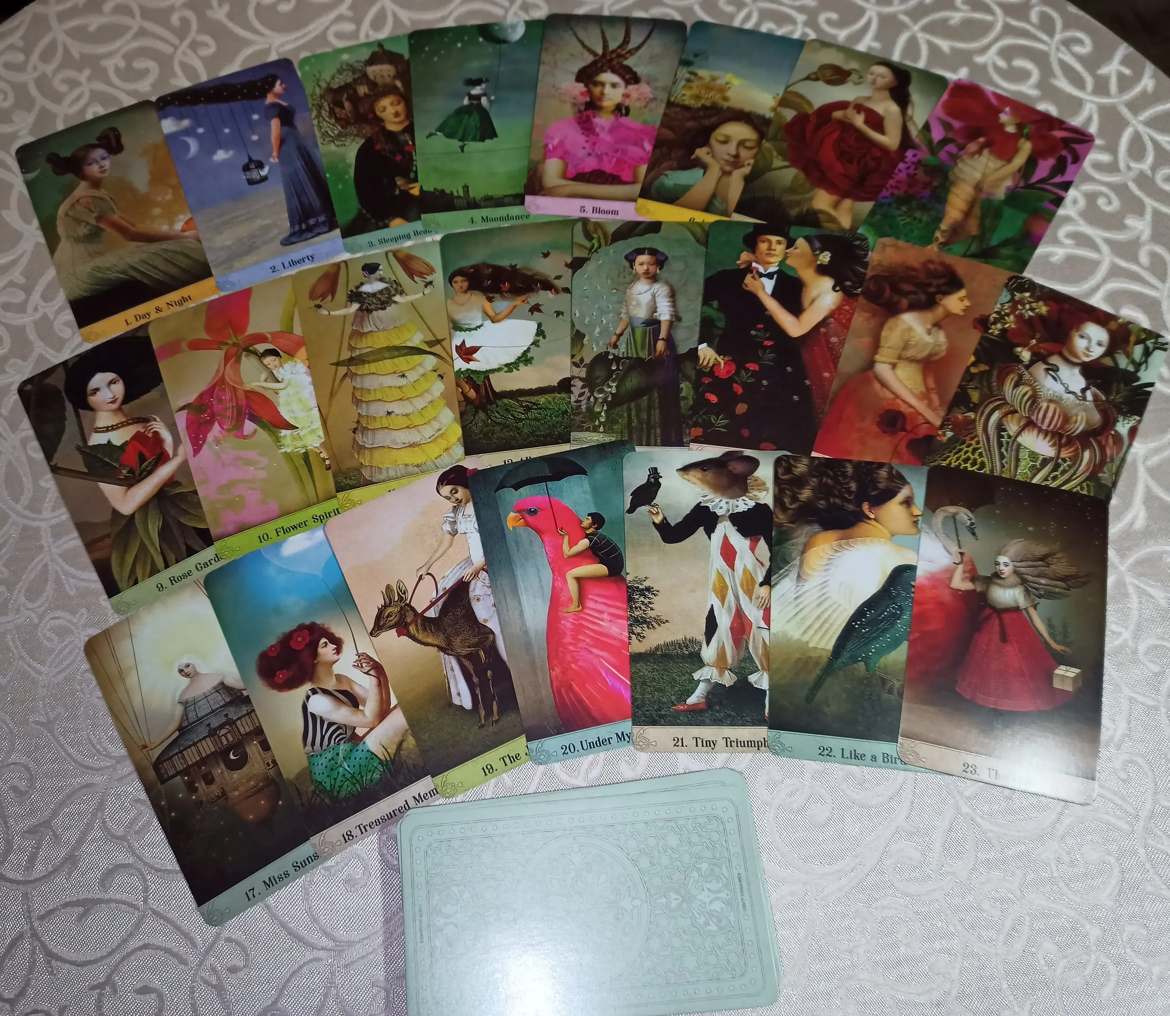У меня есть таро Мистических моментов, ещё захотелось к ним взять такой же оракул и совместить в работе. В коробочке 52 карты, картон тонковат, но имеет лаковое покрытие, вырубка отличная.