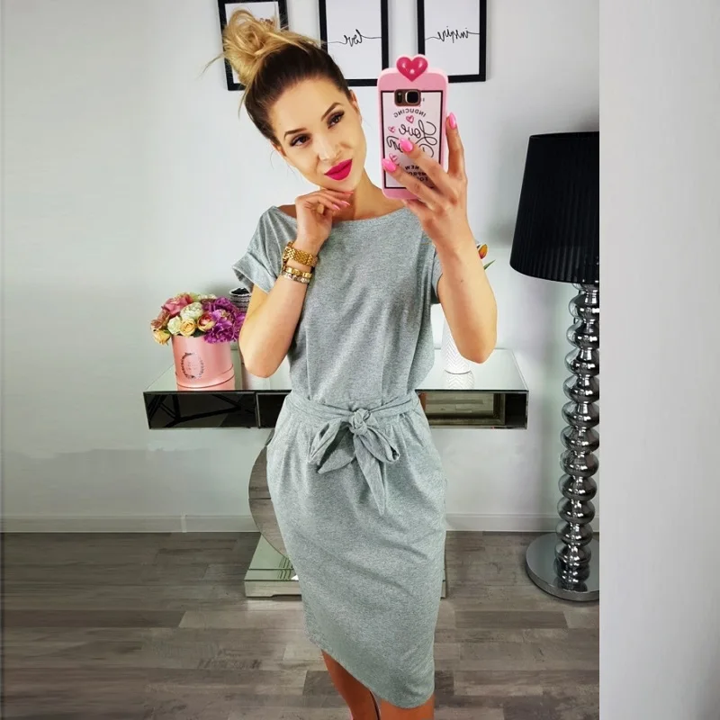 Платье женское летнее однотонное с круглым вырезом и карманами