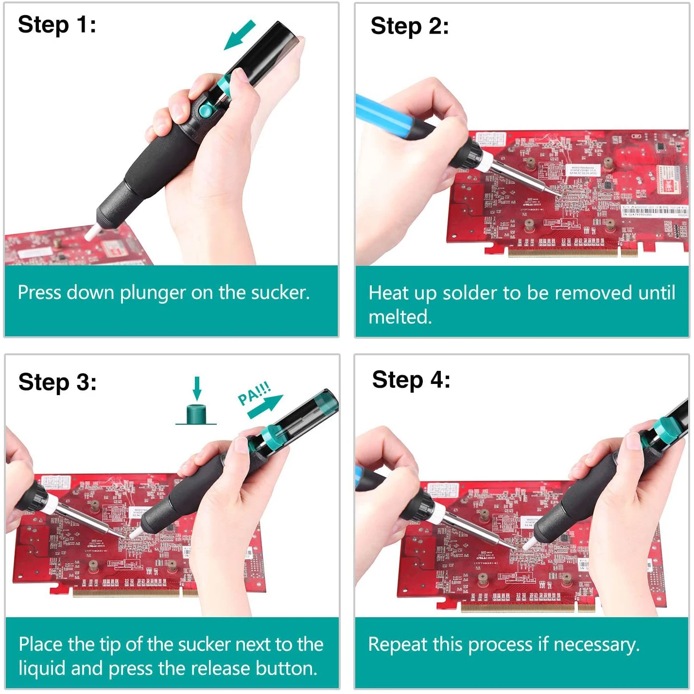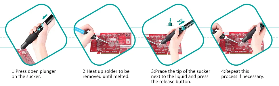 3. Удаления железа и быстро надеть Олово suctioner сопротивление пасты припоя, отсасывающее устройство для припоя, а затем нажмите кнопку.