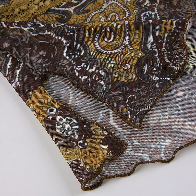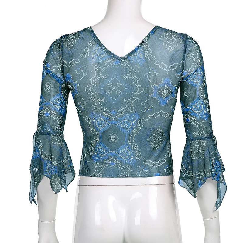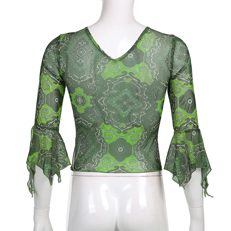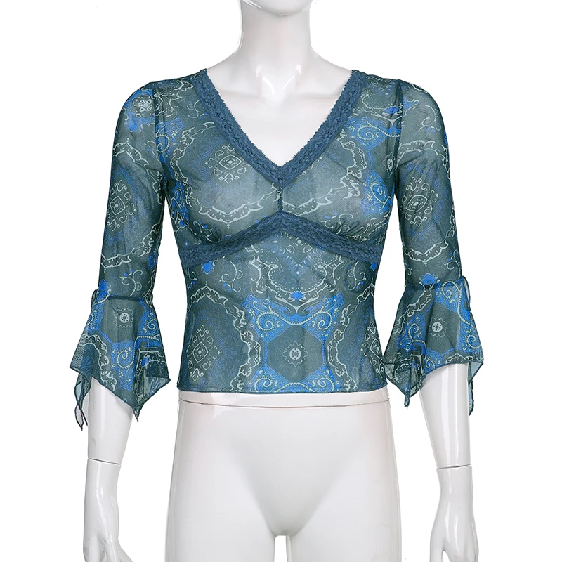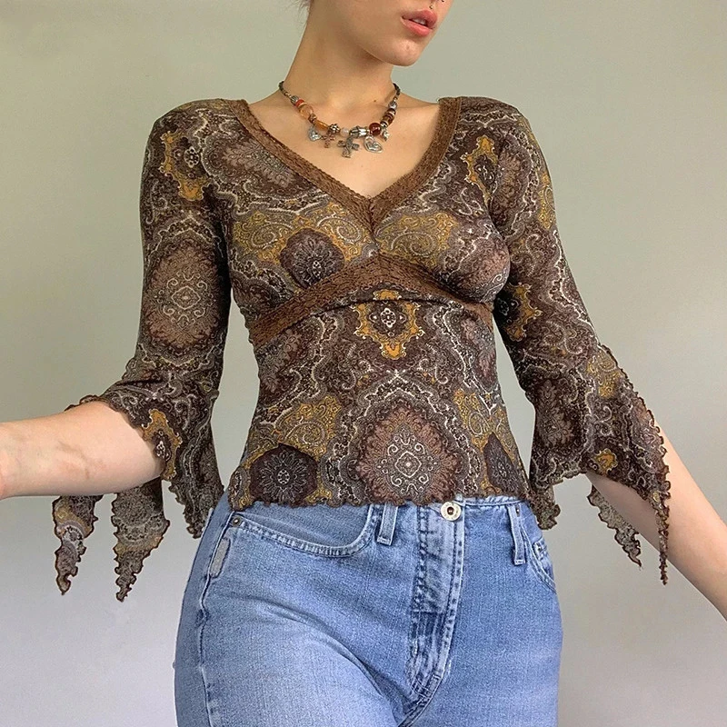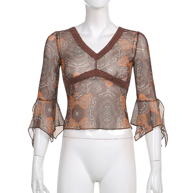 Женские винтажные кружевные сетчатые топы с цветочным принтом, элегантные коричневые футболки с рукавами-колоколами и V-образным вырезом, лето 2021
