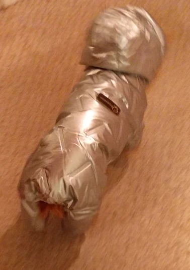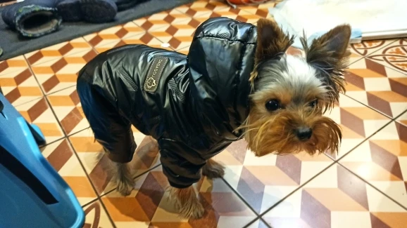 Кобинезон подошел на йорка весом 1,9 кг. Наши параметры ОГ-28 см. Ошеи- 21см. Длина по спинке-28см. Хотелось бы, чтобы кнопка была на капюшоне, но ее нет. Обратите внимание, что доставка платная. Товар шел 26 дней. А так все супер. Ткань не шелестит. Пошито аккуратно. Без запаха ткань.