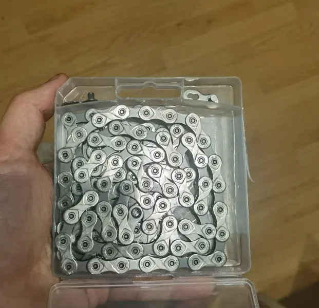 Цепь пришла быстро, выглядит Хорошо, в наличии качественная коробочка и полиграфия.На подделку не похоже, но скорей всего отбраковка: повесил рядом с цепью пробежавшей 2500к, а длина у них одинаковая. Растяжение по цепи не равномерное, видно что до середины новая цепь данная цепь короче старой, а после начинает догонять и к концу получается одинаковая длинна. Померил штангелем получилось 120мм хотя должно быть 119.7 у новой цепи. Калибр конечно не проваливается, ездить можно, но ресурс у такой цепи будет в 2 раза меньше. Открыл спор, без проблем в тот же день вернули пол цены, за что продавцу респект.