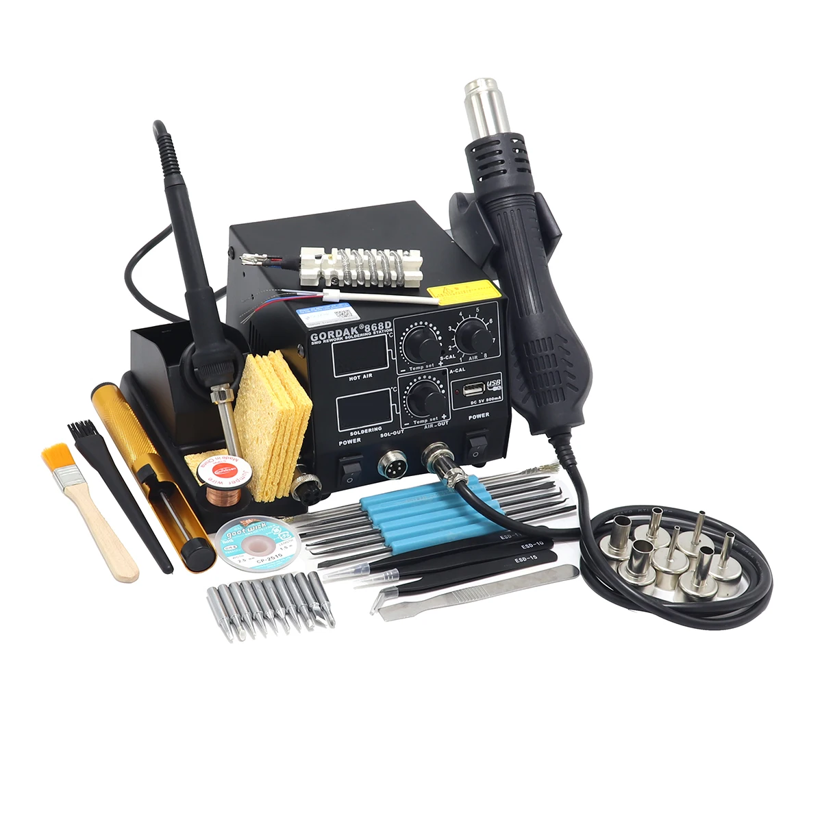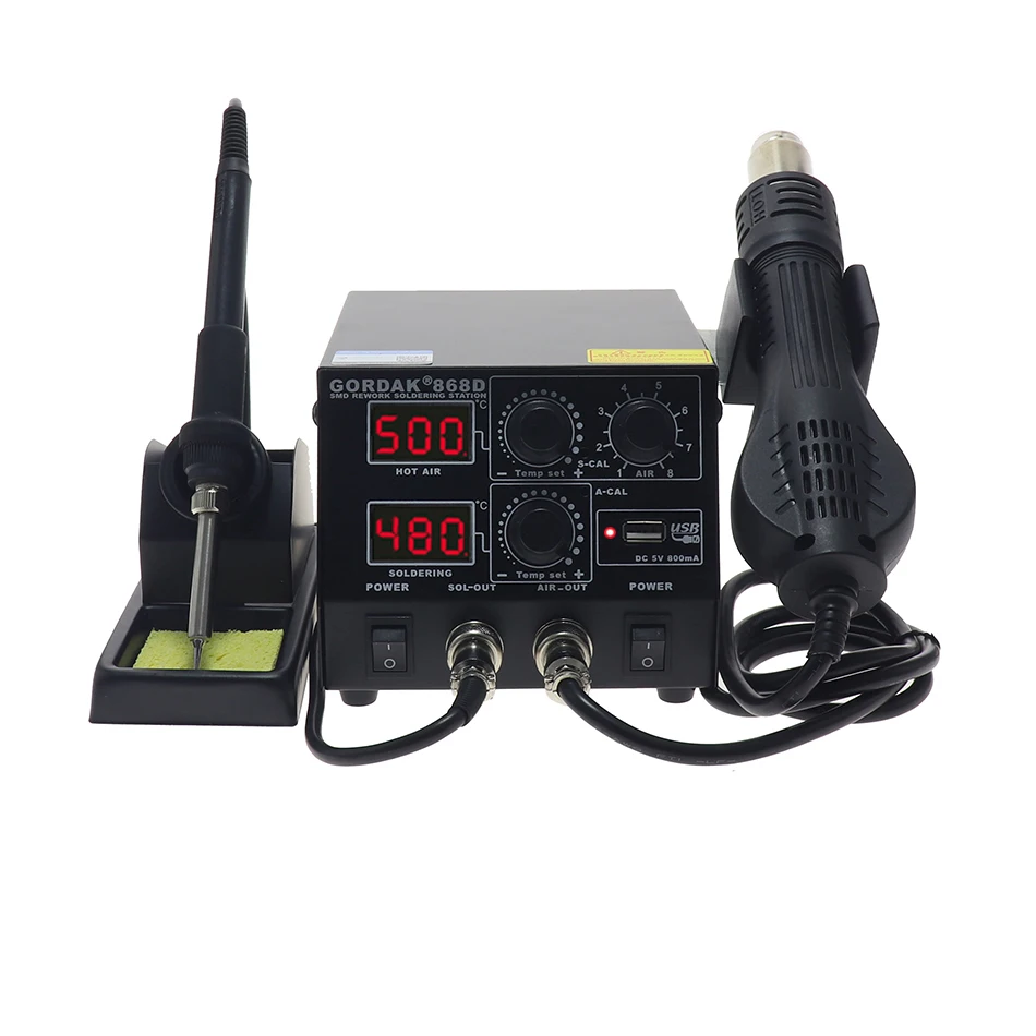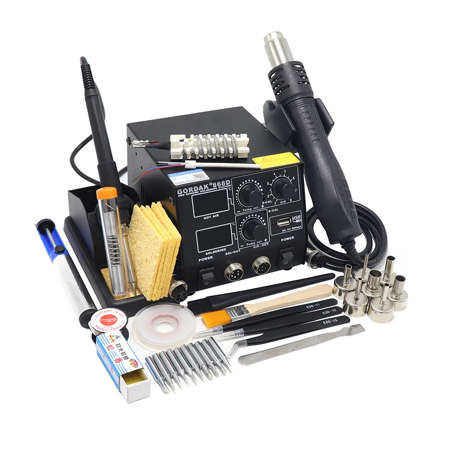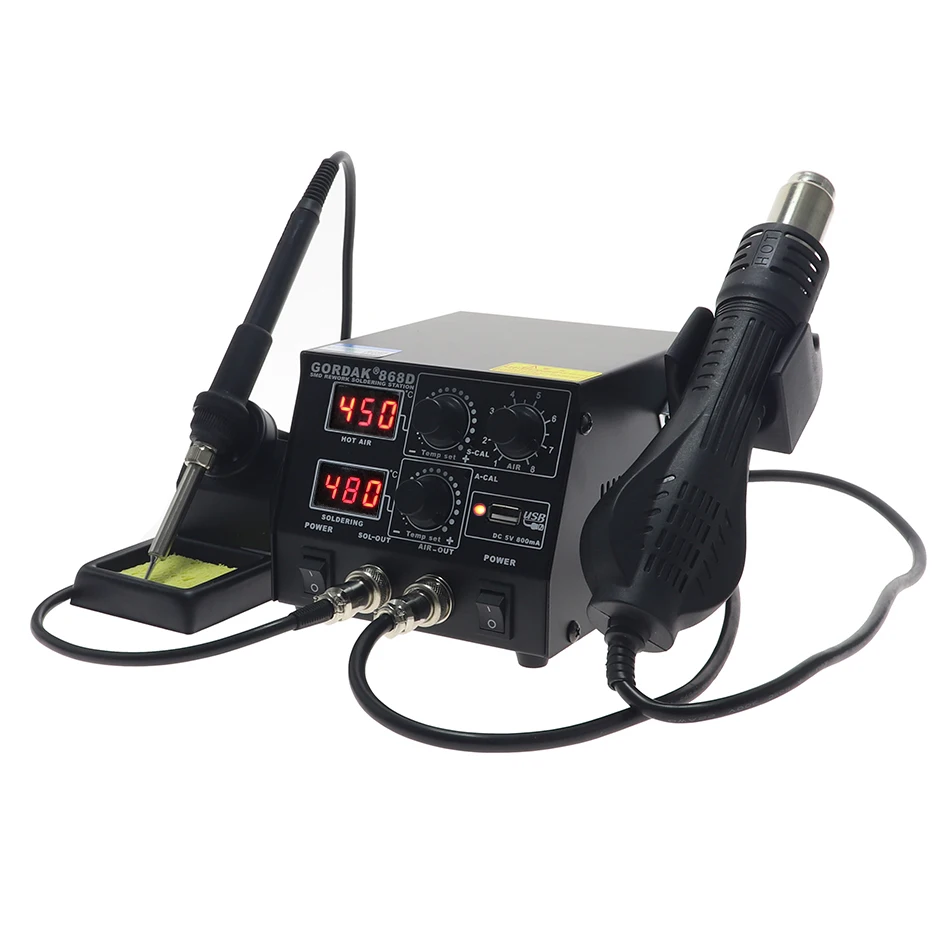 Светодиодный двойной цифровой дисплейМожно использовать отдельноСветильник Кая ручкаСтанция горячего воздуха интеллектуальные системы охлажденияОписание товара* Без бесщеточного вентилятора, с мягким ветром, подходит для сварки мелких компонентов.* Ручка станции горячего воздуха имеет спящий датчик, который может сэкономить энергию, когда не используется.* Простое управление, при самостоятельной проверке проблемы и указании функции.* Аппарат имеет функцию точной настройки температуры CAL, простое управление.* Ручка с горячим воздухом имеет функцию автоматического охлаждения, продлевает срок службы нагревателя и защищает фена.* Светильник ручка, подходящая для длительного использования.* Устройство имеет 5 в постоянного тока, зарядку через USB мА, может заряжать оборудование, соответствующее этому условию.* Небольшой воздушный каркас по дизайну, красоте и экономии места.Параметры продуктаМодель: GORDAK 868DСтанция горячего воздухаНоминальный объем: 220 В переменного тока, 50 ГцМаксимальная мощность: 450 (Вт)Модель насоса: без бесщеточного вентилятора, мягкий ветерРасход воздуха: 120 л/мин (макс.)Контроль температуры: 100 ℃-500 ℃Шум:<45 дБПаяльная станцияМаксимальная мощность: 50 (Вт)Выход напряжения: 24 В переменного токаКонтроль температуры: 200 ℃-480 ℃Сопротивление заземления:<2 МОмПотенциал заземления:<2 мВНагреватель: Китайская керамикаУпаковка: шт/корРазмер: 51*59*40 см/кор