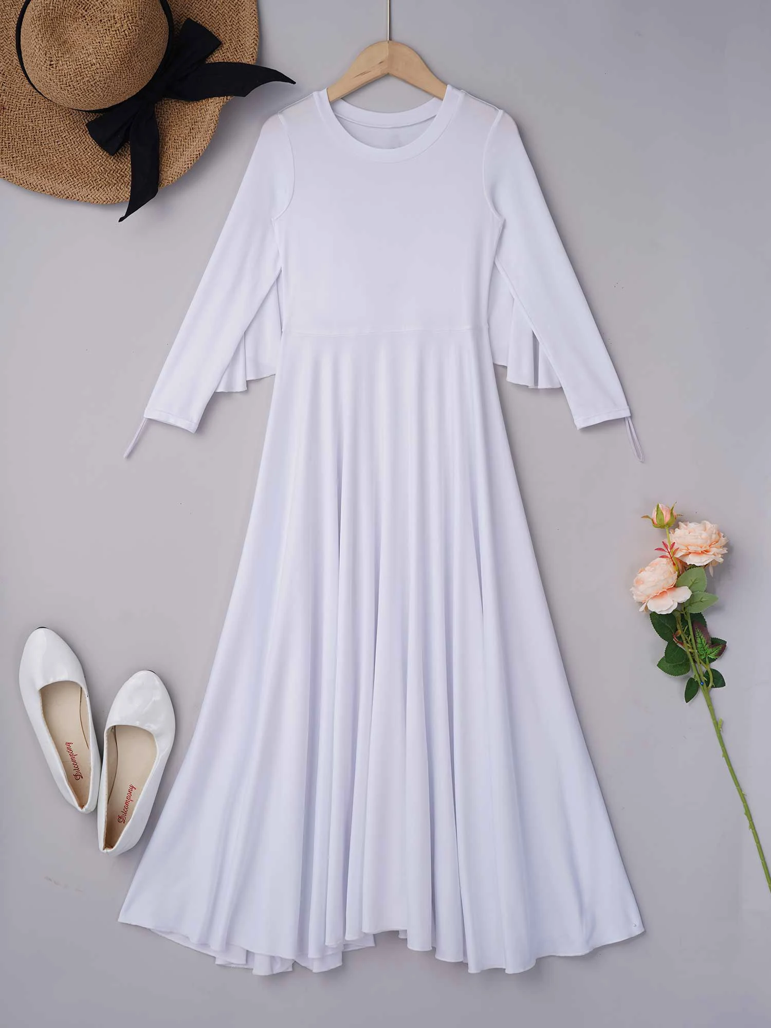 Детское платье для танцев для девочек; Однотонное длинное платье с длинными рукавами и круглым вырезом и оборками спереди; #4-14