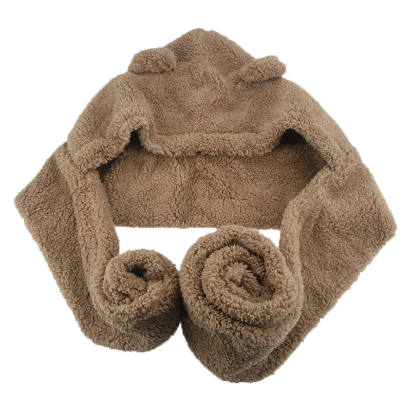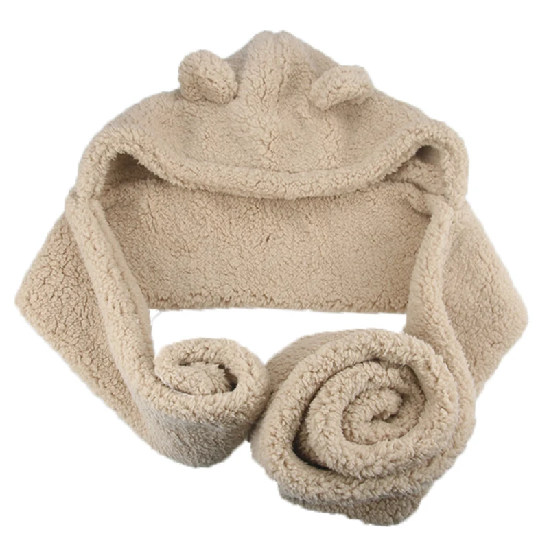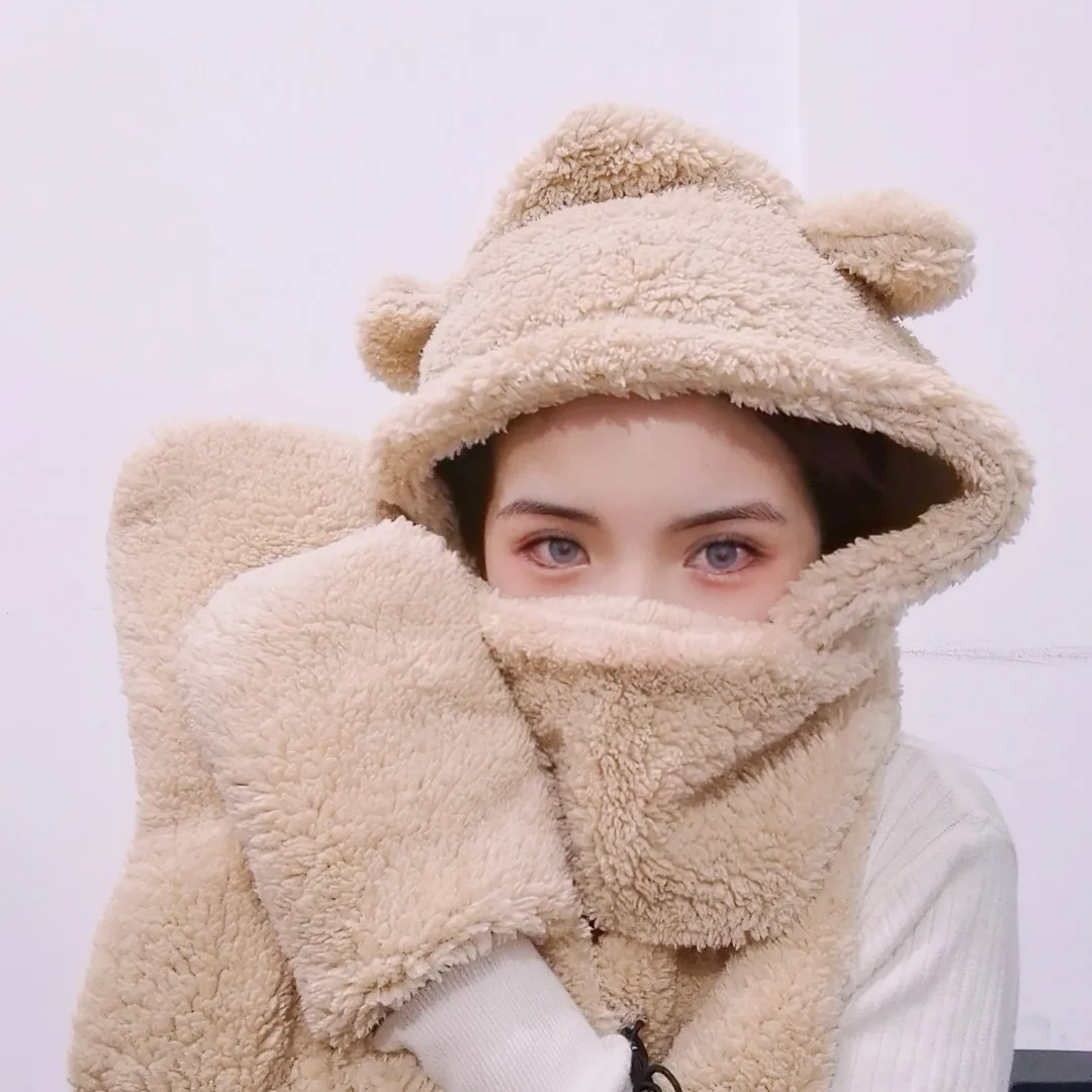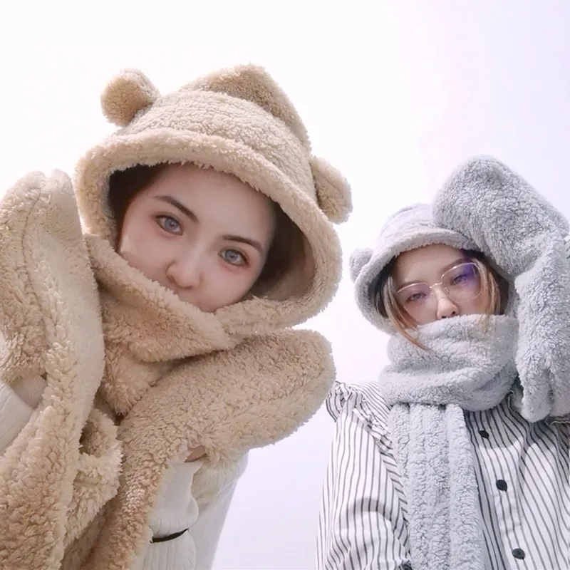Шапки из ягненка, новинка 2021, шапка с медведем, шарф, милый двойной утолщенный зимний Повседневный зимний женский шарф для снежной погоды, женская модель