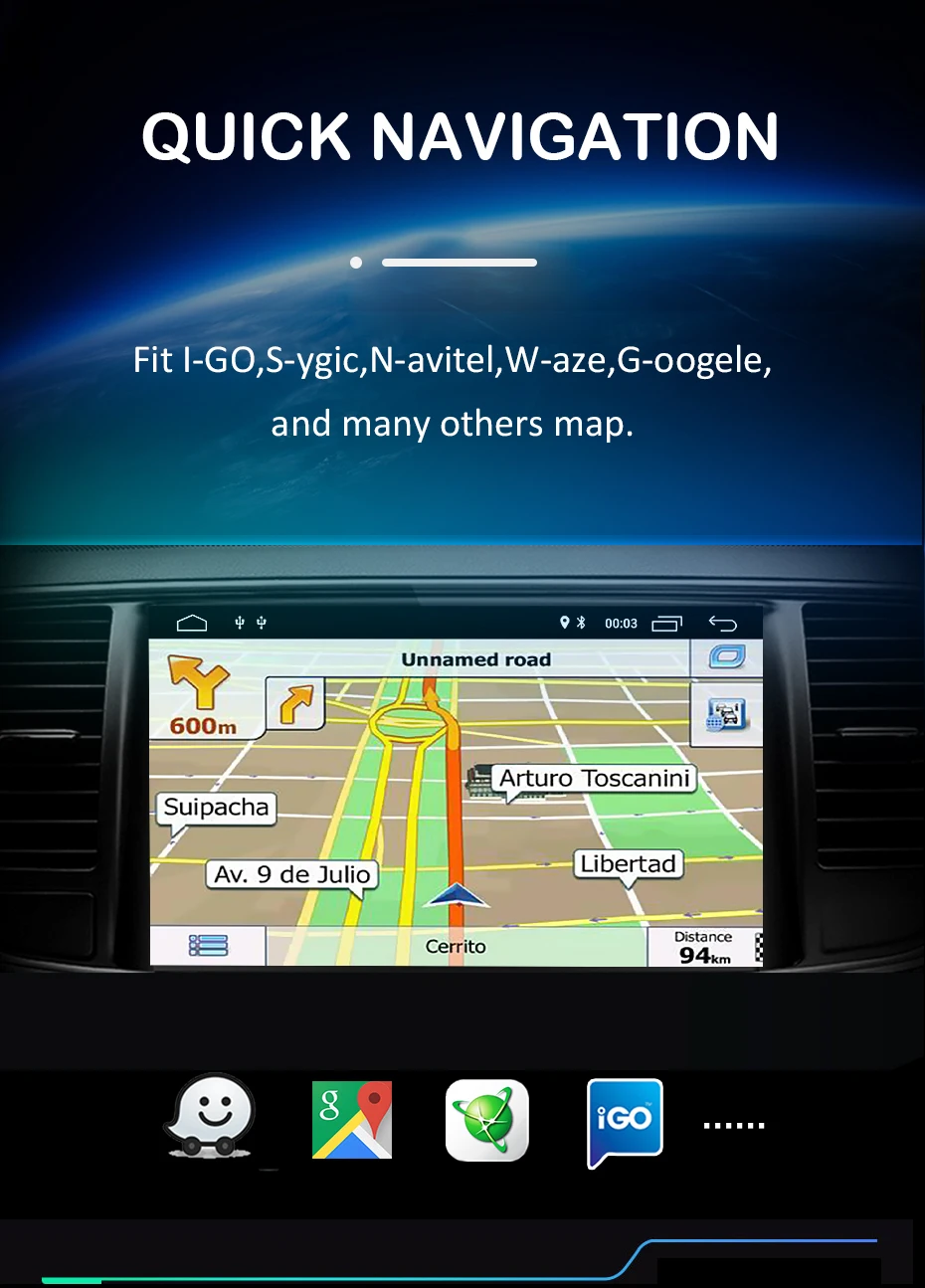 Быстрая навигацияЭто радио может устанавливать все типы карт, I-GO,N-avitel, W-aze, s-ygic... и т. Д. Вы можете установить любую карту на радио по вашему желанию. И он также поддерживает google map, вы можете установить google mapapp и связать сеть, затем вы можете использовать его. Мы установим бесплатную карту на радио, прежде чем отправить ее вам, если вам это нравится, вы можете использовать ее напрямую, если вам это не нравится, вы можете установить новую карту на радио по вашему желанию.