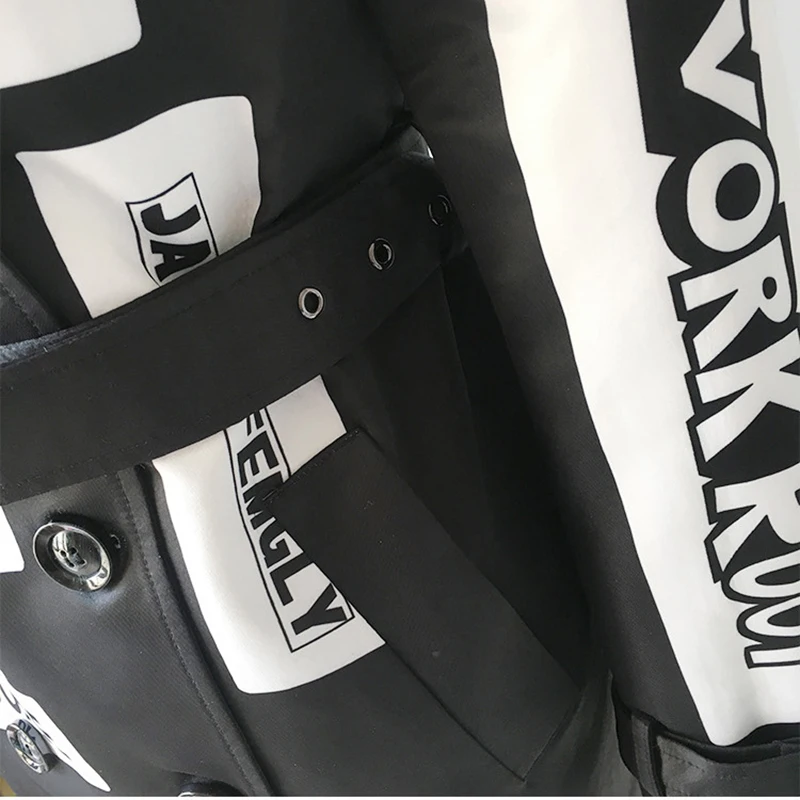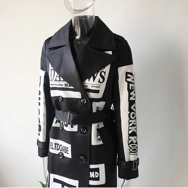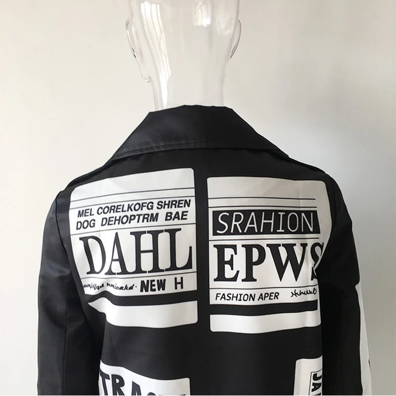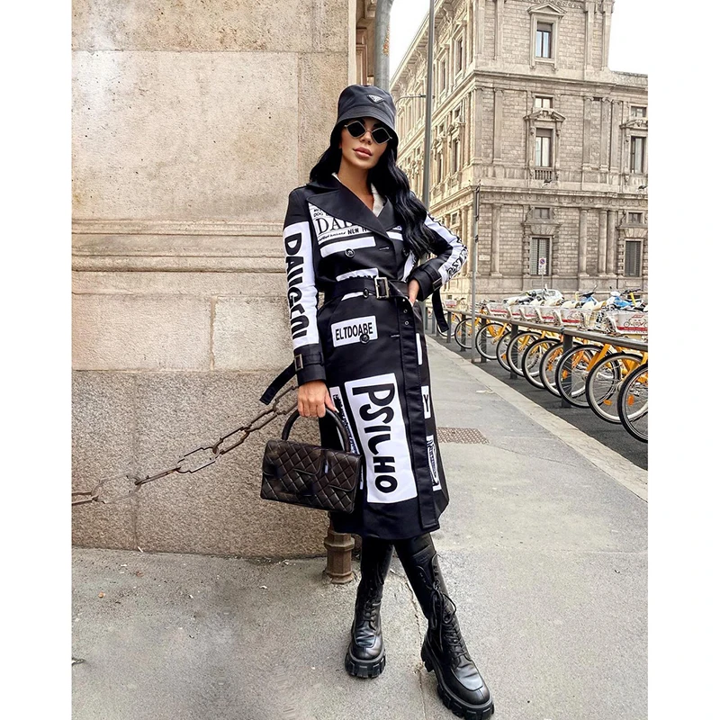 Женская ветрозащитная куртка с надписью, черно-белая куртка с длинным рукавом и поясом, Повседневная Длинная Верхняя одежда, 2021, осень 90108
