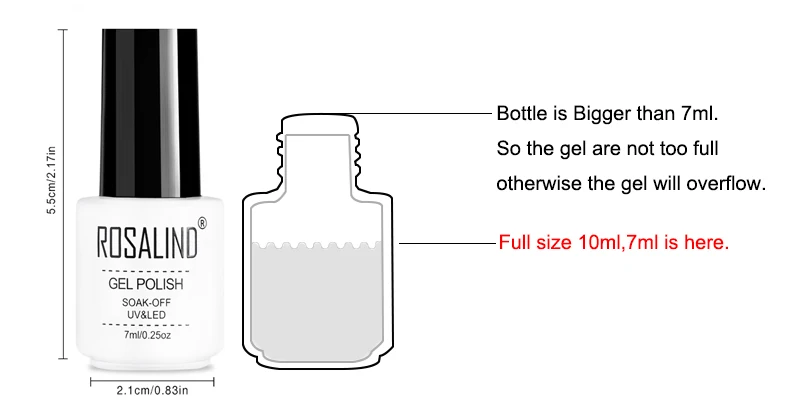 Название бренда: ROSALINDМатериалы: УФ-изгибаемая смолаОбъем: 7 мл/0,25 ozВес нетто: 25 гСертификация: MSDS, SGSИнструменты для отверждения: УФ-лампа, светодиодный светильник, УФ/светодиодный CCFL лампаКачество-наш первый приоритет.Гели остаются блестящими до 30 дней.Самые популярные цвета на выбор.Подходит для всех случаев.Три шага для маникюра самостоятельно:1.-форма поверхности ногтей, очистить кутикулы, для полировки ногтей поверхности и очистить пыль.2.-Нанесите базовый слой ROSALIND (не забудьте запечатать край ногтя).Вылечите светодиодный светильник в течение 60 секунд или УФ-лампа в течение 2 минут.3.-нанесите первый слой цвета ROSALIND.Вылечите светодиодный светильник в течение 60 секунд или УФ-лампа в течение 2 минут.4. Нанесите больше слоя цветного пальто, если цвет недостаточно яркий.5.-нанесите верхнее пальто ROSALIND.Вылечите светодиодный светильник в течение 60 секунд или УФ-лампа в течение 2 минут.6.-протрите липкий остаток на ногтях очищающим средством.Два шага для удаления:1.-Замочите ногти в акриловое средство для удаления около 5 минут.2.-аккуратно разорвите весь кусок эмали для ногтей на каждый ноготь.Напоминание:1.-Вес нетто 7 мл. Но емкость бутылки составляет более 7 мл,Гель не будет полностью заполнен в бутылке!2.-Держите плотно закрытыми, держите подальше от солнечного света, держите в недоступном для детей месте.