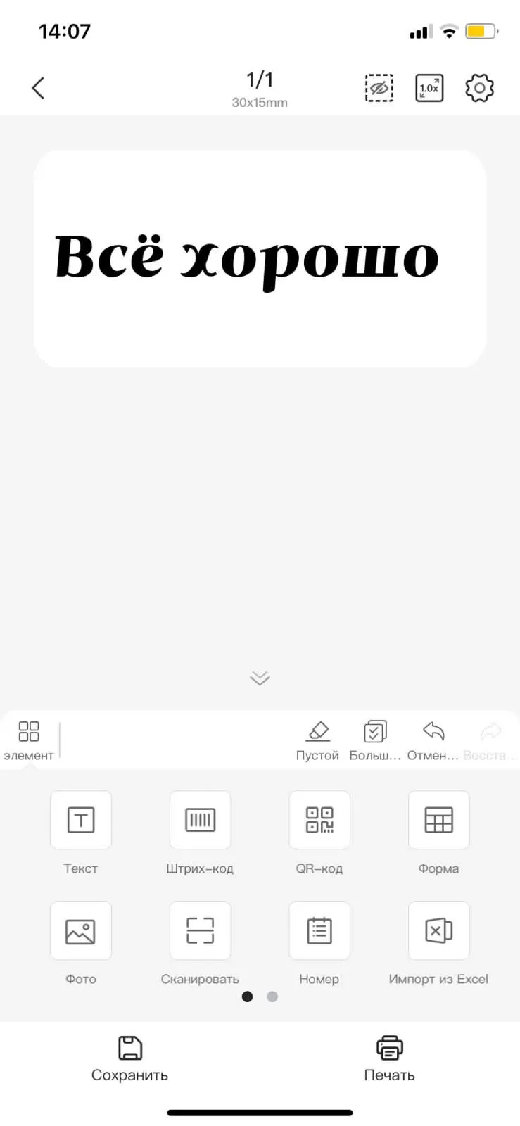 Все работает. Приложение сама нашла в GPlay. Оно сразу становится на языке телефона. Разобраться просто. Первая наклейка в рулоне может напечататься не полностью, но следующая уже "выставится" где нужно. Мне понравилось