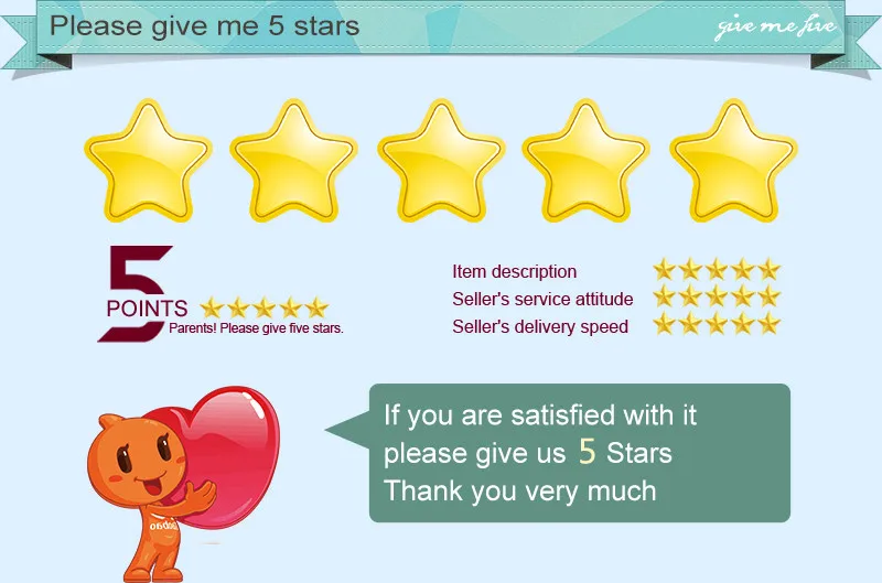 1. Пожалуйста, оставьте отзыв с 5 звездами, если вы удовлетворены нашими продуктами и услугами, Мы будем признательны (товар, как описано, 5 звезд, общение 5 звезд, время доставки 5 звезд).2. Если вы получили поврежденный товар или неправильный стиль, пожалуйста, не оставляйте сначала отрицательный отзыв, пожалуйста, свяжитесь с нами, мы разберемся с этим и выработаем лучшее решение, ваше удовлетворение-это наше стремление к лучшему.
