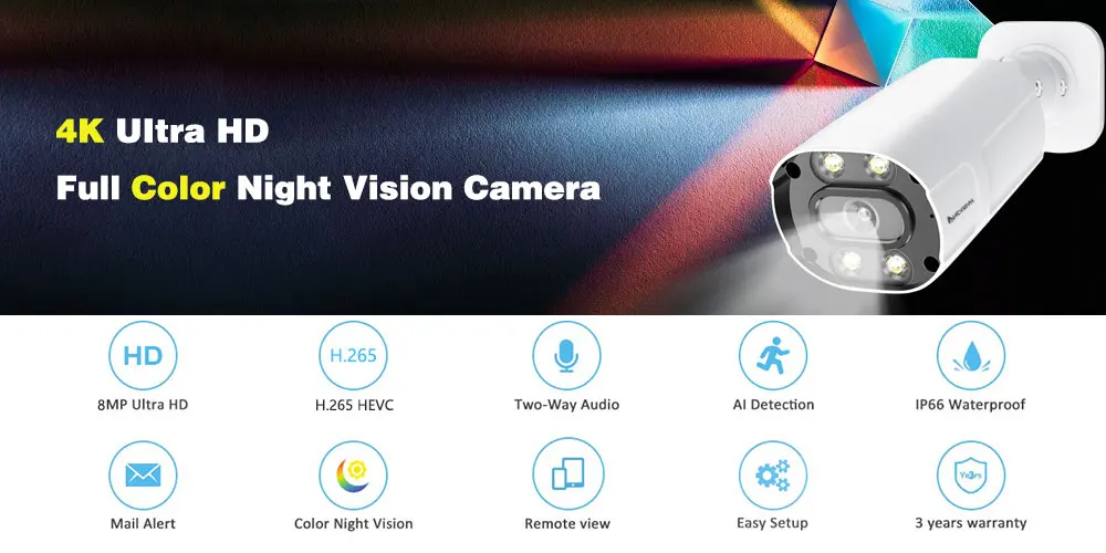 1. Дисплей высокой четкости Ultra HD 8 Мп, расширенное Сжатие видео H.265;2. IP-камера Ultra HD 8MP POE, металлический материал, подходит для внутреннего и наружного применения, надежная Домашняя безопасность;3. Поддержка питания через Ethernet,Plug and play, простая настройка;4. Поддержка записи звука, все камеры оснащены встроенным микрофоном;5. Поддержка дневного ночного видения Ultra HD;6. Поддержка переключателя двойного фильтра IR-CUT, днем и ночью для контроля, цвет не имеет частичного искажения цвета;7. Поддержка обнаружения движения, оповещений по электронной почте, нескольких языков;8. Поддержка Android,Iphone,Ipad, ПК, VMS,P2P view;9. Удаленный доступ в любом месте и в любое время;10, подходит для всех видов приложений;