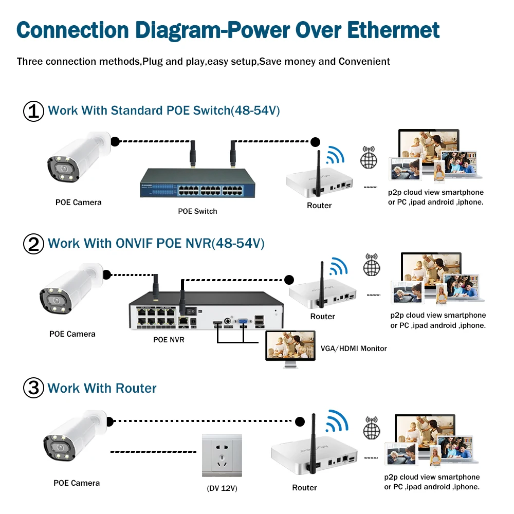 Не нужны дополнительные силовые кабели, адаптеры или переключатель. Подключи и играй и простая настройка.Экономия денег и удобство, POE NVR = переключатель NVR + POE.