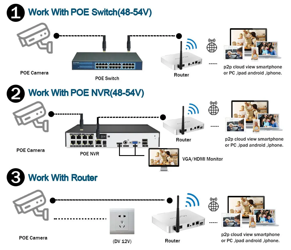 Простая настройка, всего 4 шага для просмотра мобильный телефон, просмотра видео в режиме реального времени из любого места и в любое время с помощью смартфона, стола или ПК с передовой технологией P2P, вы можете получить удаленный доступ к вашей системе за считанные минуты или меньше, нет необходимости в переадресации, удаленный доступ никогда не был таким простым!