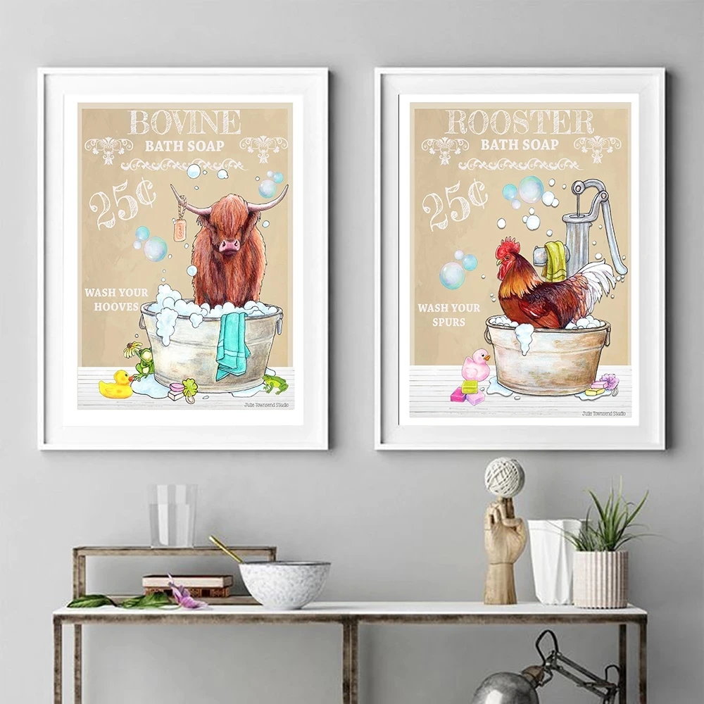 Винтажный постер в ванне с животными в стиле фермерского дома, петух, корова, холст, живопись, ванная комната, настенные картины, скандинавские картины, декор для детской комнаты