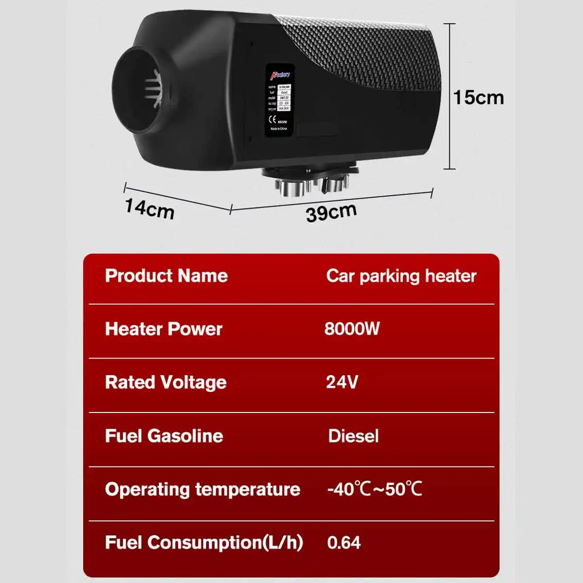 Характеристики:Модель: 8 кВт автомобильный обогревательМощность нагрева: 8 кВт (регулируемая мощность)Топливный бензин: дизельТип кондиционера автомобиля: отоплениеНоминальное напряжение: 24 В или 12 В (опционально)Расход топлива (л/ч): 0,1-0.53л/чРабочая температура нагревателя: -40 ℃ ~ 50 ℃Рабочая температура масляного насоса: -40 ℃ ~ 40 ℃Размер изделия: 38*13,5*13,5 см/15,0*5,3*5,3 дюймовВнутренний диаметр выходной трубы: 70 ммЦвет: сетка (как показано на рисунке)Корпус: пластик