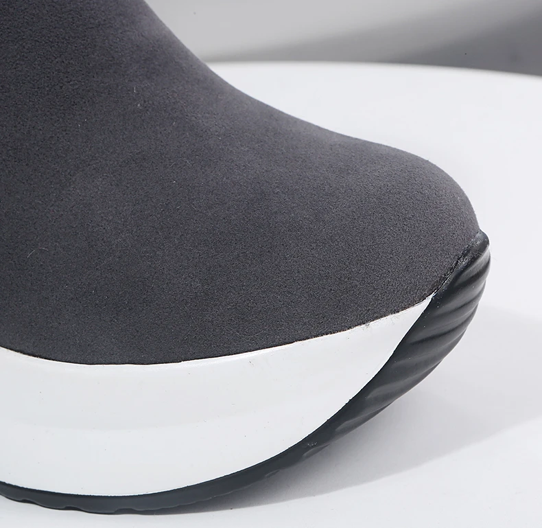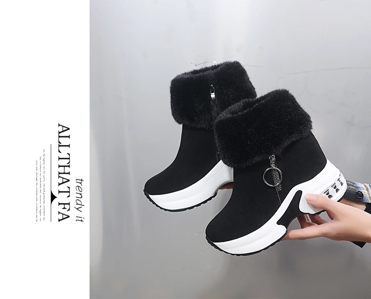 Ботинки женские на высокой танкетке, теплые меховые кроссовки, удобные зимние ботинки на платформе, черные плюшевые замшевые, с резиновой подошвой