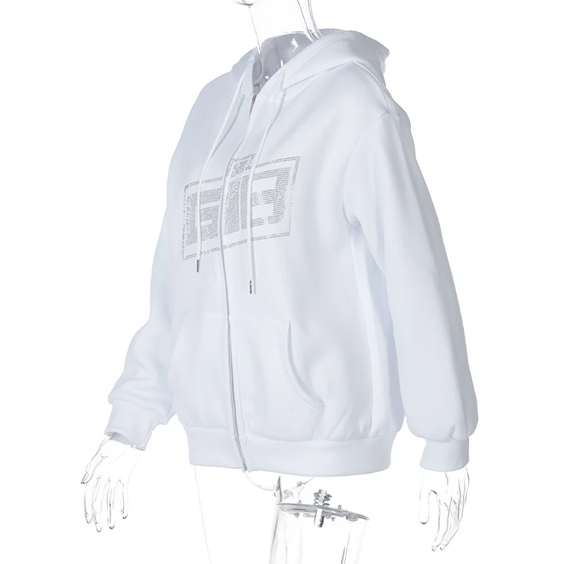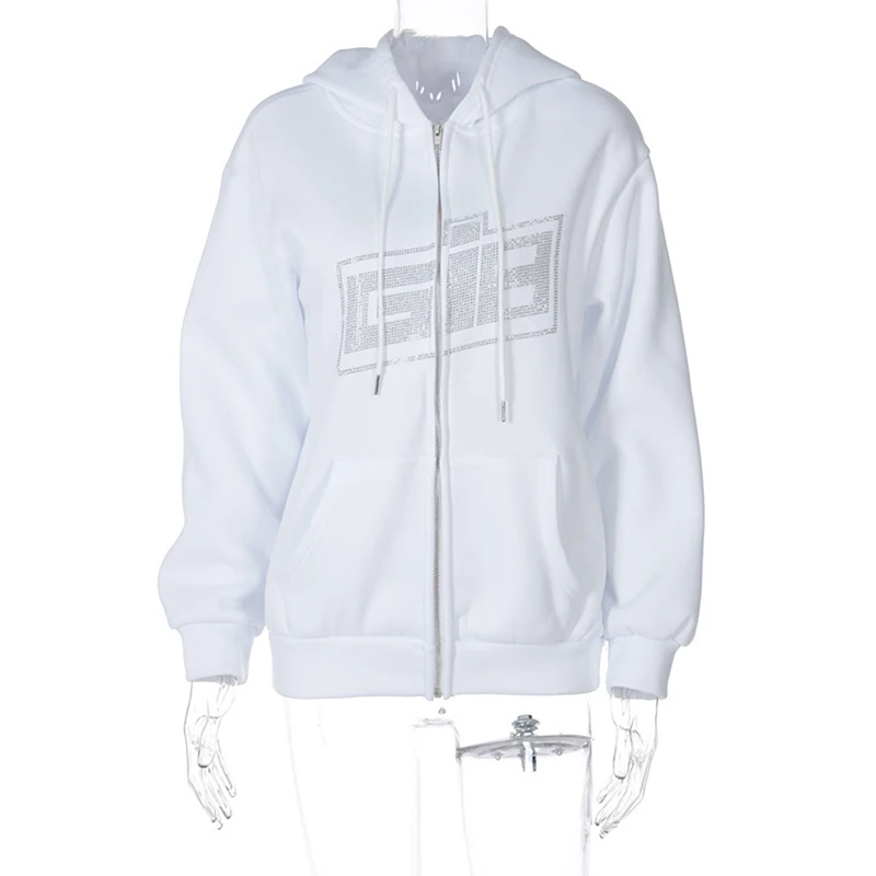 Женская толстовка с длинным рукавом, толстовка с капюшоном, на молнии, свободная уличная одежда, повседневные теплые пальто Стразы с надписью на осень и зиму