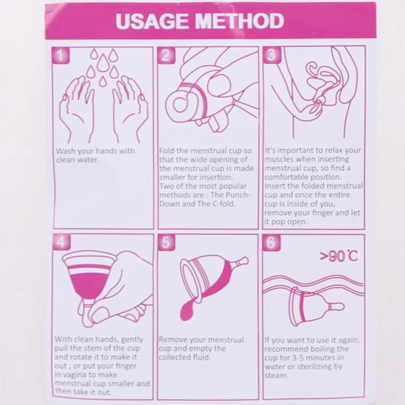 Использование и советы:Ручка может быть обрезана, чтобы соответствовать каждой женской влагалище.Стерилизовать менструальную чашку в кипяченой воде 2-3 минуты. (Чашка не будет искажена)Как только ваша менструальная чаша будет на месте, дайте ей мягкое вращение, чтобы помочь установить ее на месте.Менструальная чашка создает вакуумное уплотнение внутри вас, предотвращая протекание.Вы можете носить менструальную чашку до 12 часов!Сломайте уплотнение перед удалением вашей менструальной чашки.