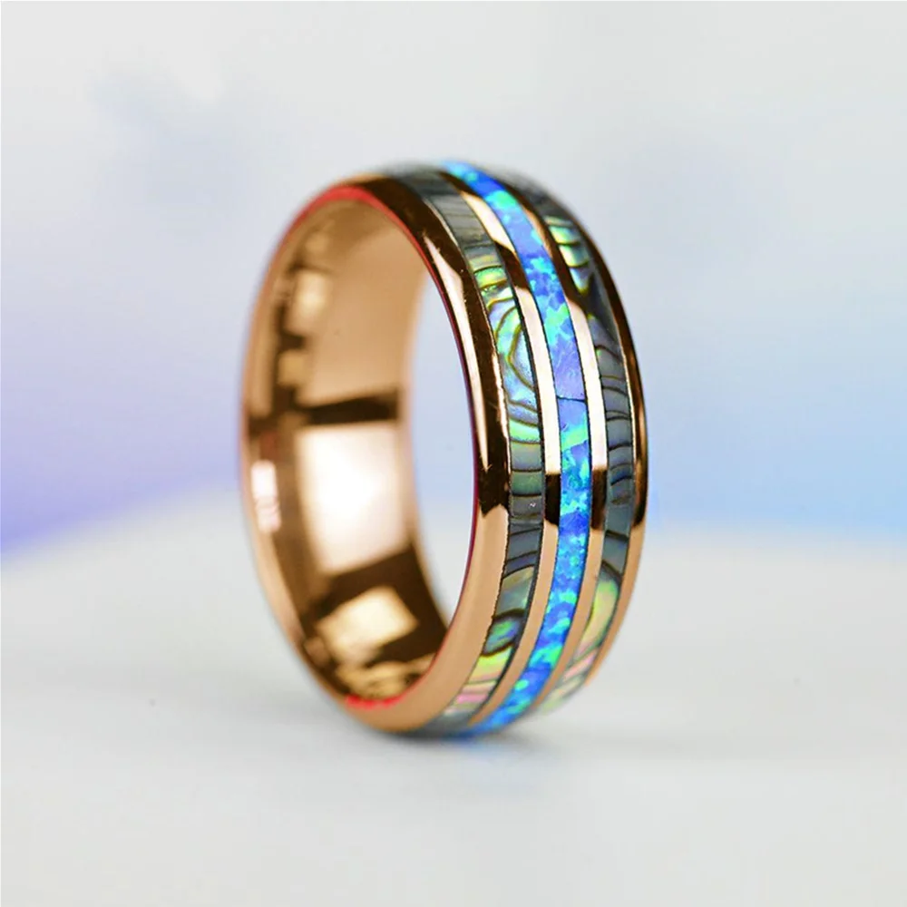 Модные кольца 8 мм из розового золота, вольфрама, свадебные мужские кольца из нержавеющей стали, инкрустация, Морская раковина, искусственная оболочка, мужские обручальные кольца, ювелирные изделия