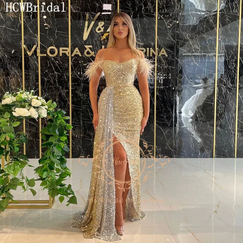Вечернее платье с украшенными бусинами и перьями, с открытыми плечами и Боковым Разрезом, прямые Свадебные платья для особых случаев и выпускного вечера