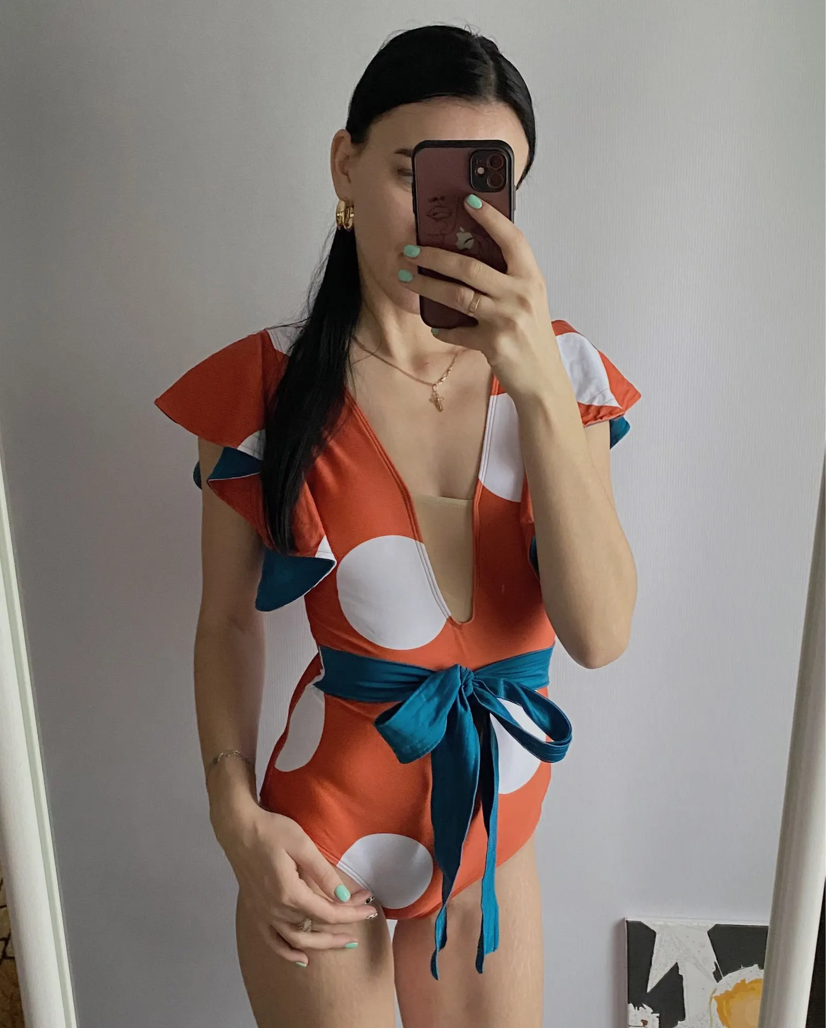 Спільний купальник, в горошок Матеріал спандекс/поліестер На свої параметри 82/69/92 зріст 168 см - замовила розмір S Є поясок, який пришитий з обох сторін Можна зав’язувати як ззаду так і спереду Між грудьми є вставка із сіточки Рукава об’ємні Для фото сесії з шляпкою буде взагалі супер круто