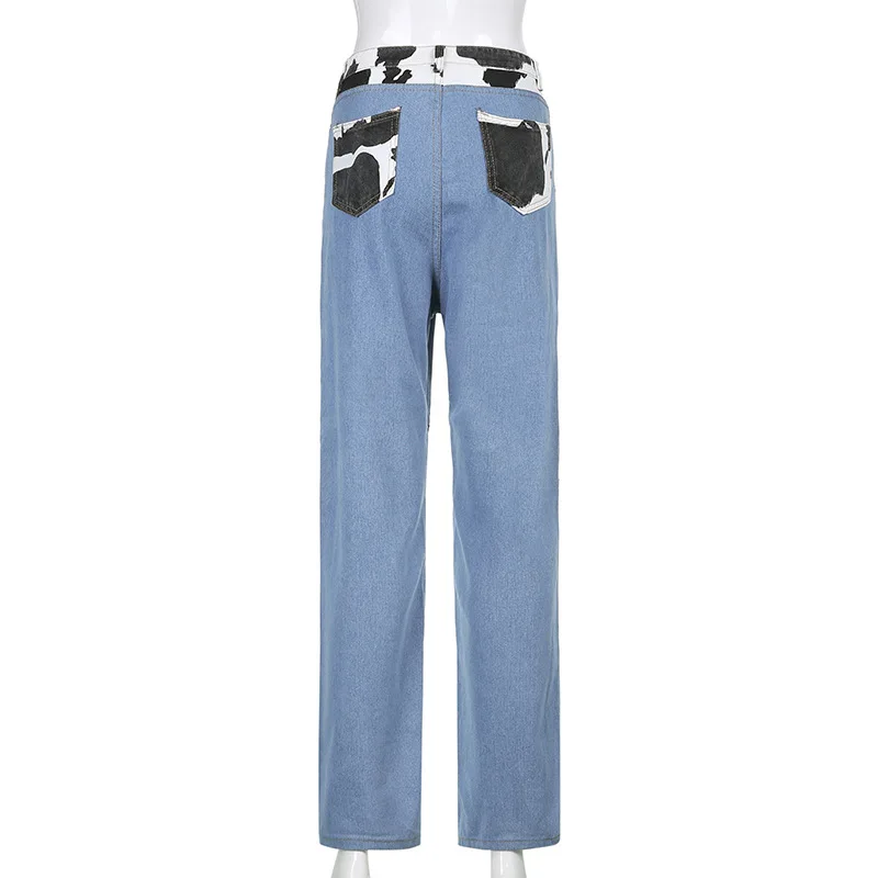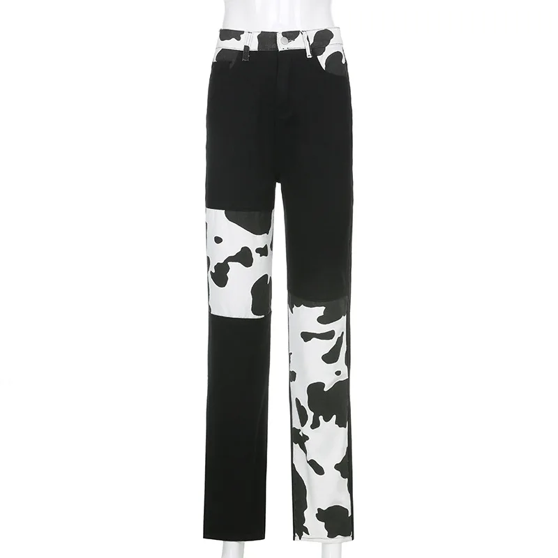 Женские джинсы в стиле пэчворк, повседневные Прямые брюки с высокой талией и принтом коровы, черные длинные брюки в стиле Харадзюку 90-х годов, Дамская уличная одежда на осень