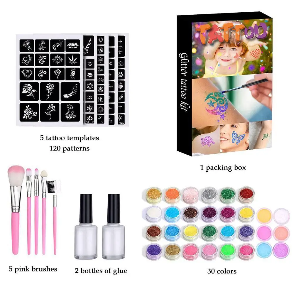 Посылка включает в себя:24 * блеск6 * светящийся порошок2 * Клей5 * кисть5 * пустотелый шаблон татуировки (120 узоров)1 * бумажная коробка