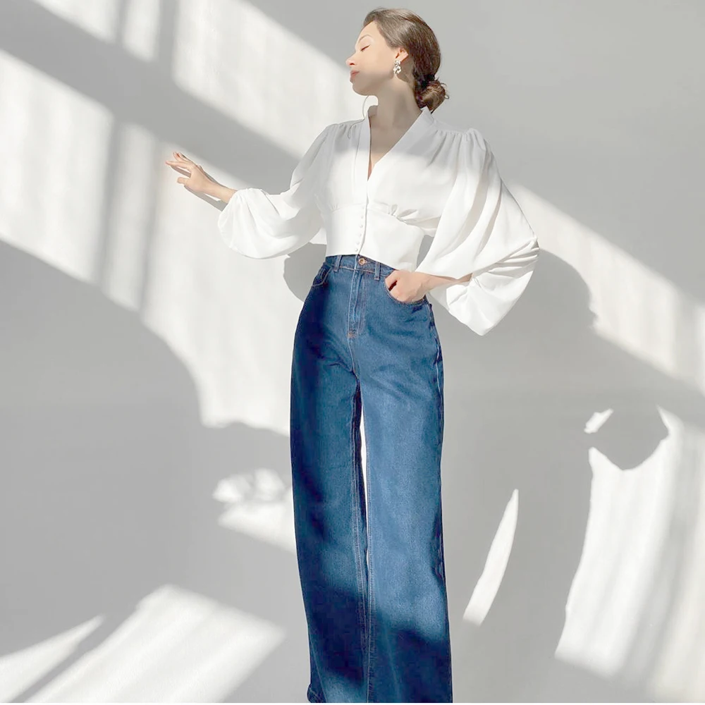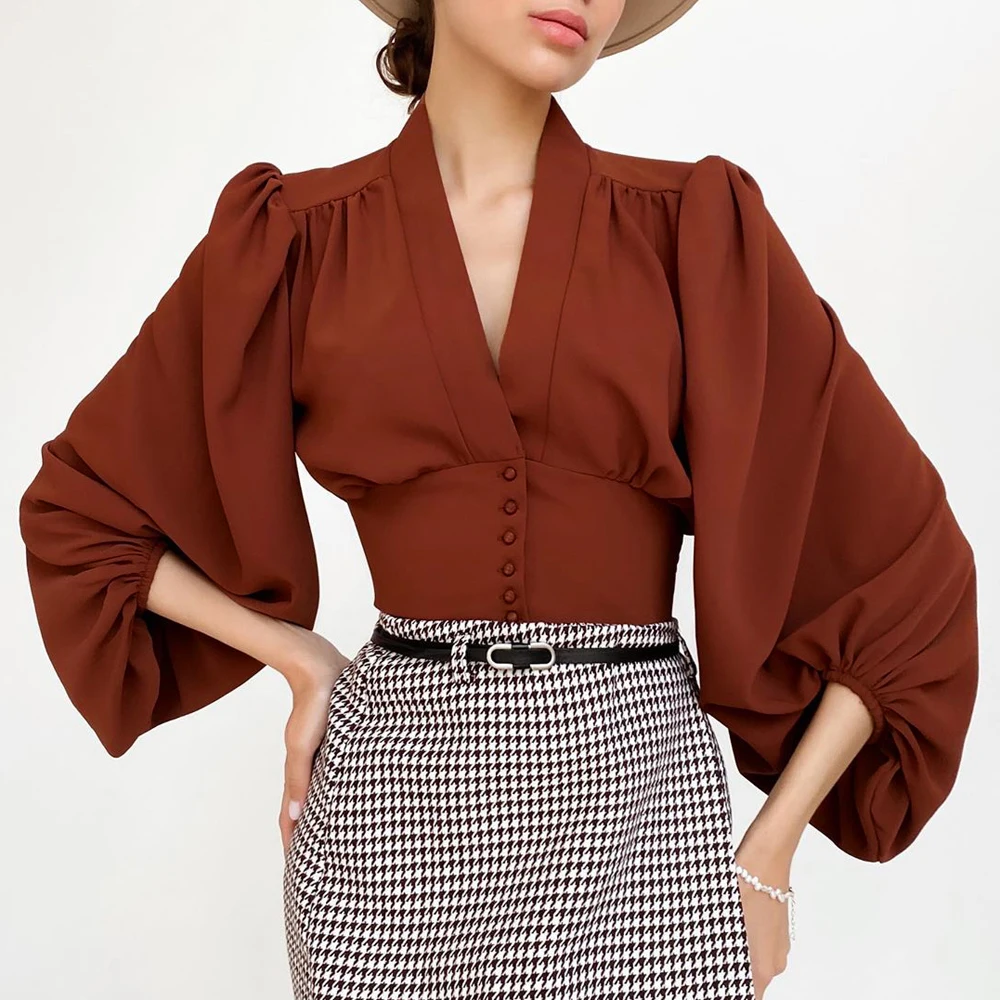 Женская блузка на пуговицах, с длинным рукавом-фонариком, с V-образ...
