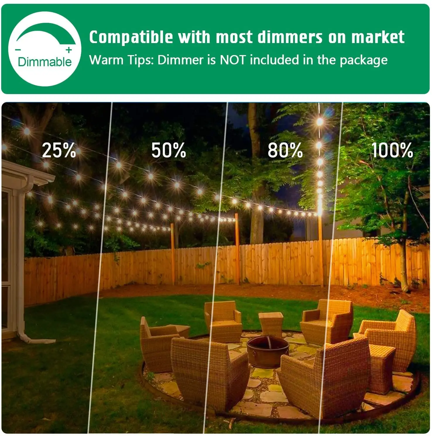 [Диммируемая]: водонепроницаемая наружная лампа имеет супер Совместимость с большинством диммеров на рынке (не входит в комплект), и только необходимо регулировать яркость в соответствии с потребностями конкретных случаев. Что еще более важно, изысканный внешний вид и идеальный размер придают ему Сказочный шарм. Фонари для заднего двора, фонари для двора, Светильники для кафе, лампы для бистро, фонари для перголы, Свадебные огни очень популярны среди клиентов, создавая красоту украшения и романтическую атмосферу.