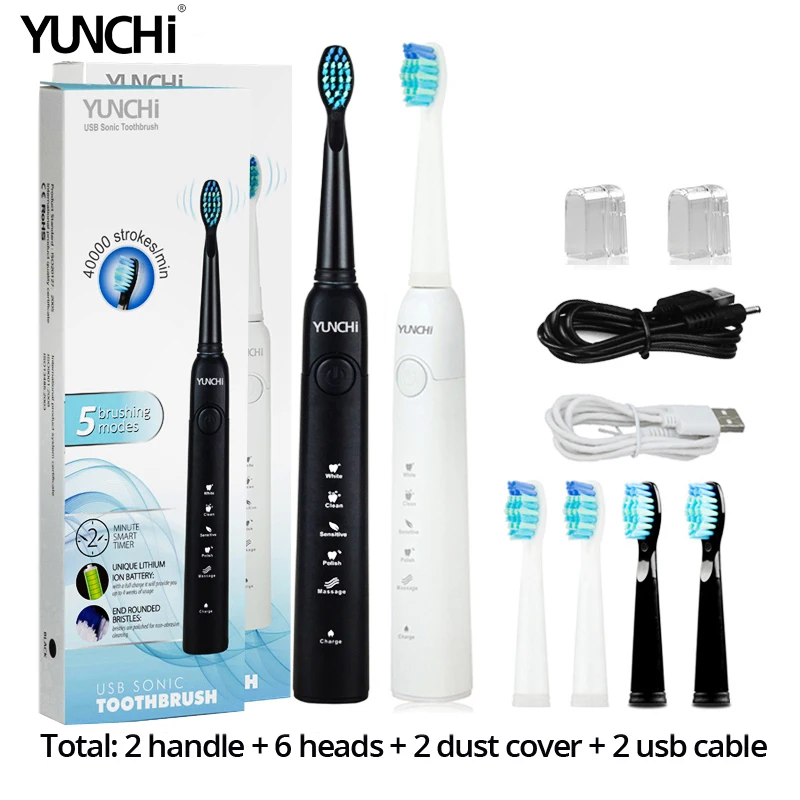Звуковая электрическая зубная щетка с зарядкой от USB, зубные щетки для взрослых с таймером, 5 режимов с сменными головками, IPX7, водонепроницаемые