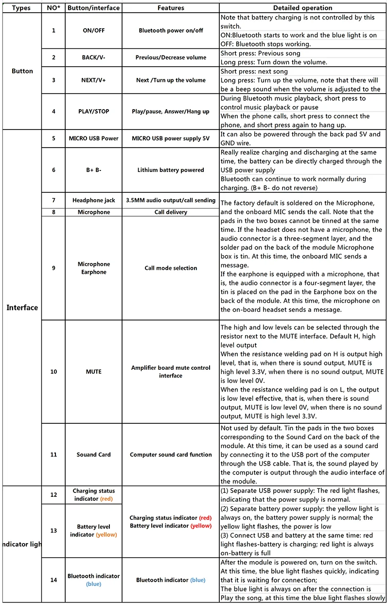 К переключению режима зарядки и разрядки в это время, после чего Bluetooth автоматически перезапустится, автоматически подключится и сохранит предыдущее состояние воспроизведения) функция входящего голосового вызова: после подключения Bluetooth, включите режим звука вызова в настройках Bluetooth. При звонках вы можете ответить или повесить трубку через кнопку воспроизведения/остановки. Вы можете выбрать отправку с помощью микрофона оригинальной гарнитуры (при условии, что гарнитура имеет функцию вызова 4-сегментного типа) или с встроенного микрофона (по умолчанию), подробности см. В описании функции. Когда используется звуковая карта компьютера: оловите колодки в двух коробках, соответствующих звуковой карте на задней стороне модуля, А затем подключите его к USB-интерфейсу компьютера через USB-кабель, который можно использовать как звуковую карту. То есть звук, воспроизводимый компьютером, выводится через аудиоинтерфейс модуля. Подробности см. В описании функций. (По умолчанию не включено) Размер продукта: