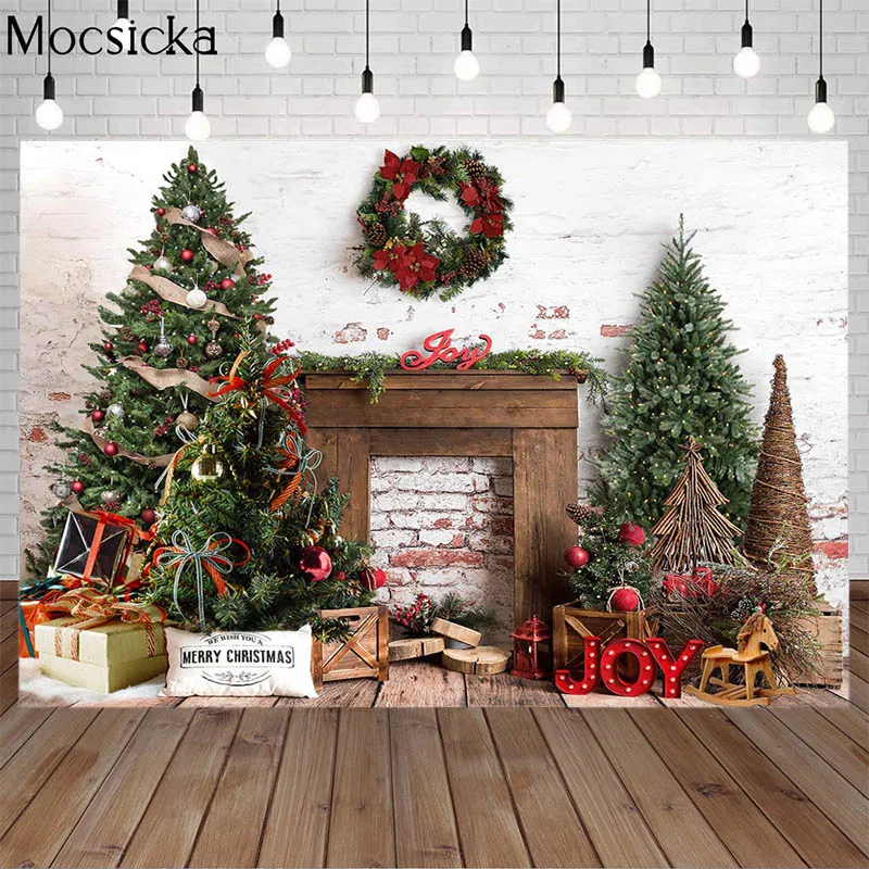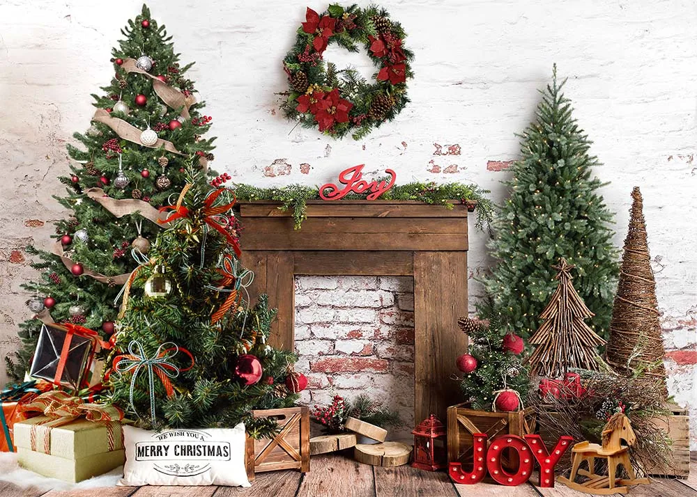 Рождественский камин фотография Фон винтажная кирпичная стена Рождественская елка подарок венок Декор дети портрет фото фон