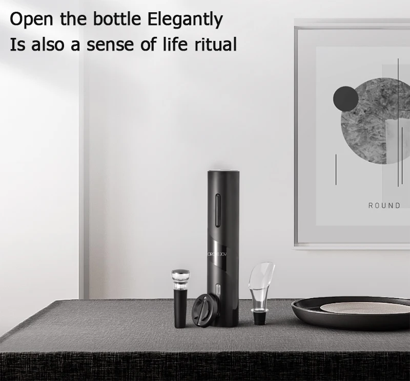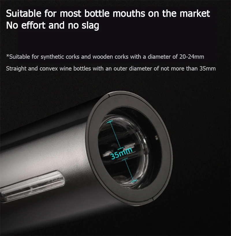 ▪Простота в использовании: Простое управление нажатием кнопки, нажмите кнопку «вниз», чтобы вынуть пробку из бутылки вина, нажмите кнопку «вверх», чтобы удалить пробку из открывателя вина.