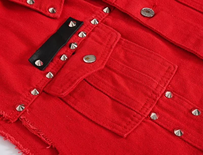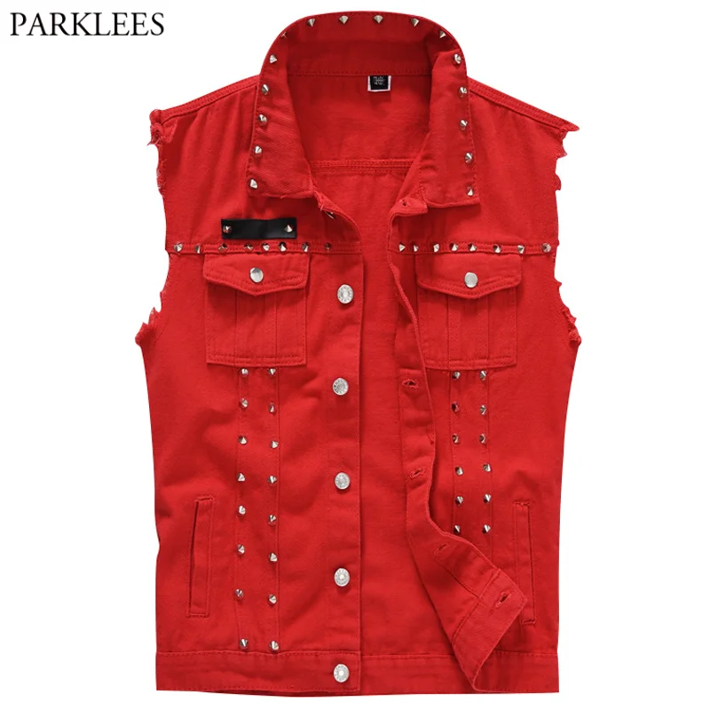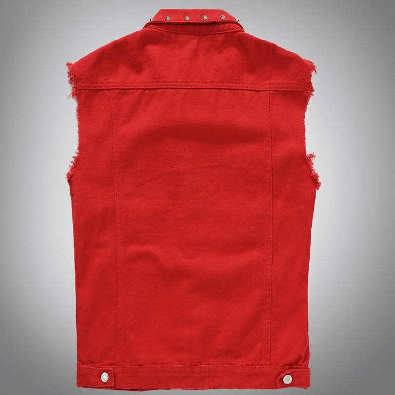 Мужской модный красный джинсовый жилет с заклепками в стиле панк-ро...