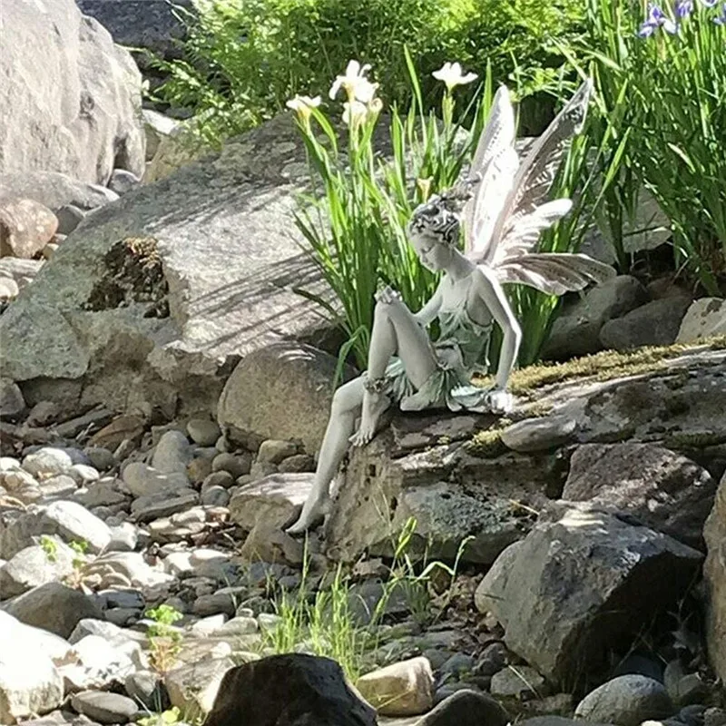 Статуя из смолы, сидящая фея, садовый орнамент, скульптура для крыл...