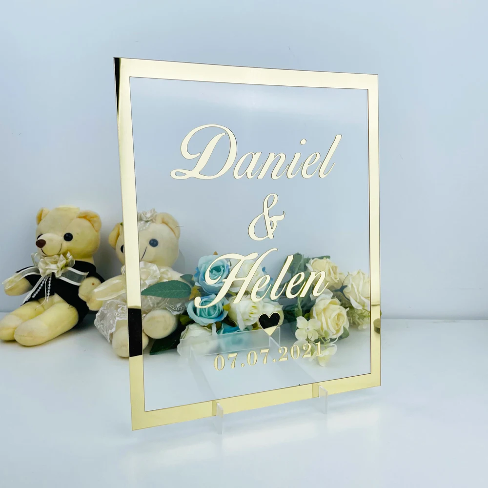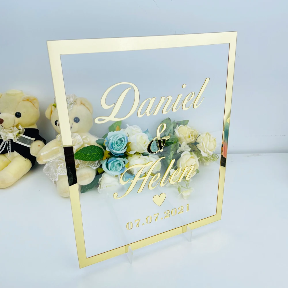 Индивидуальный Свадебный знак с именем и датой, акриловая Золотая зеркальная рамка, знак слов, персонализированный знак приветствия, праздничный декор с подарком