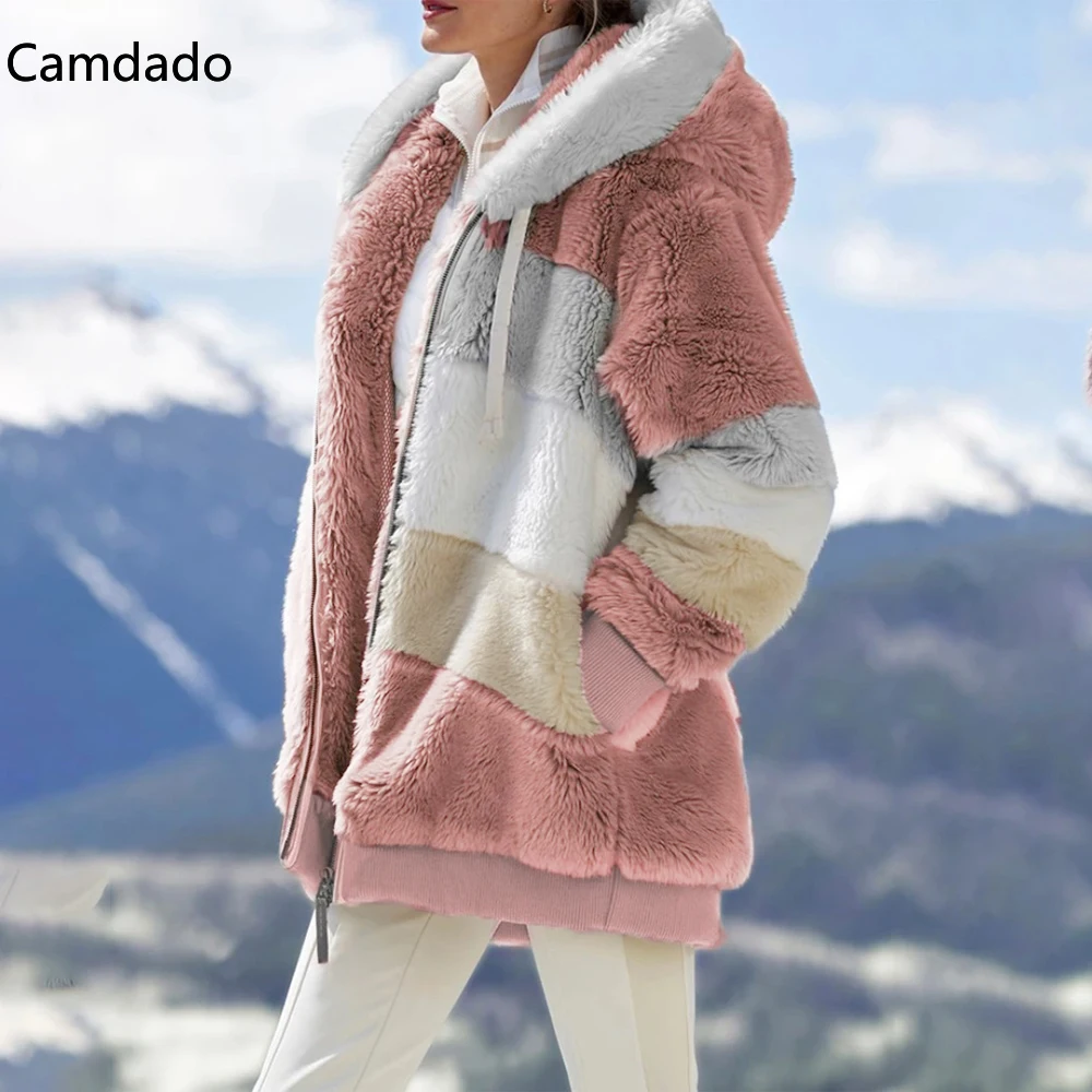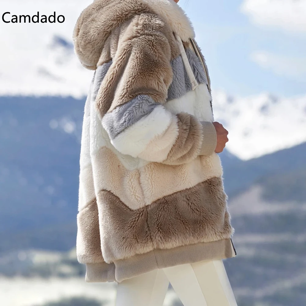 Winter Hooded WomenFur Fashion Plush Patchwork Zipper