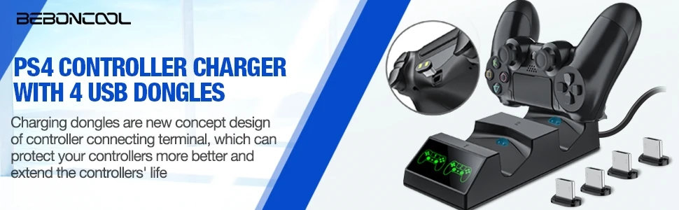 【Для PS4 зарядное устройство с 4 Micro Usb Dongles】Дунглы для зарядки-это новая концепция контроллера, соединяющего терминал, закрепленный на зарядном порту контроллера и не требующий отключения во время использования, которые могут лучше защитить ваши контроллеры и продлить срок службы PS4 / PS4 Pro / PS4 Slim контроллеров. В комплект также входят 8 ручек большого пальца для джойстиков контроллера PS4.【Быстрая зарядная док-станция для контроллера PS43 часа быстрой беспроводной зарядки по стандарту с 2 встроенных портами micro USB, pro зарядное устройство идеально подходит для двойного шока 4 PS4 / PS4 тонкий/PS4 Pro контроллеров, экономьте время для одновременной зарядки двух контроллеров.【Светодиодный индикатор зарядкиВстроенный светодиодный индикатор на экране шрифта четко показывает состояние зарядки, usb-кабель подключает зарядку «контроллер» поворачивается к зеленому цвету, подключите контроллер поворачивается к красному цвету, заряженный полностью превращается в зеленый цвет снова, полезно знать статус.【Безопасная и противоскользящая зарядкаВстроенное защитное устройство с чипом, защита от перезарядки и противоскользящая конструкция, 4 противоскользящие резиновые удерживают зарядное устройство на месте, что делает вас надежным даже на ночь.【Станция хранения для 2 контроллеров 】Для быстрой зарядки PS4 с надежным usb-портом, 4 микро-usb зарядных ключа для вашего контроллера, специальная Нижняя конструкция для удобного размещения.