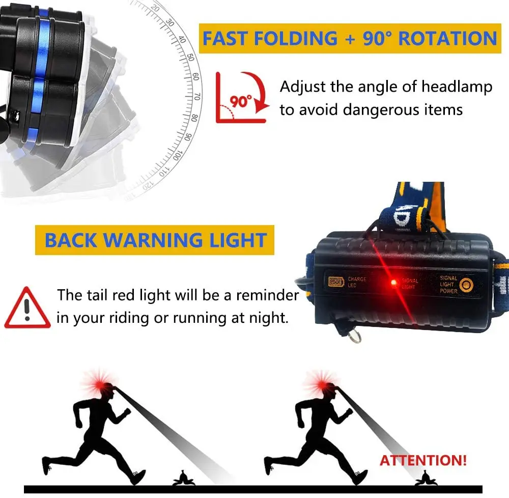 【Перезаряжаемая головка USB 】 эта головная лампа весит всего 200 г, заряжается через предоставленный usb-кабель, перезаряжаемая usb-фара занимает всего 2-3 часа для полной зарядки. Красный предупреждающий светильник на батарее чехол для обеспечения вашей безопасности в тех случаях, когда Велосипеды в темное время суток.