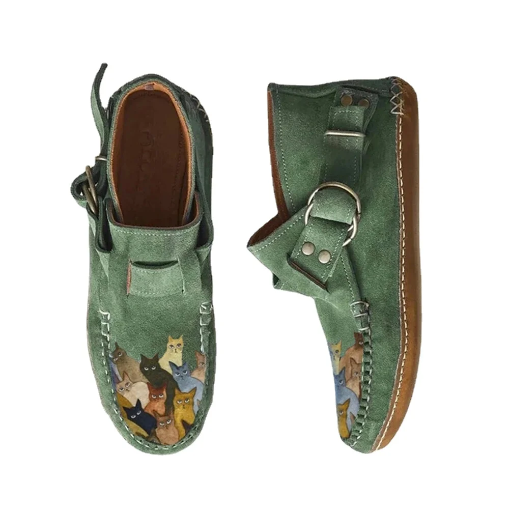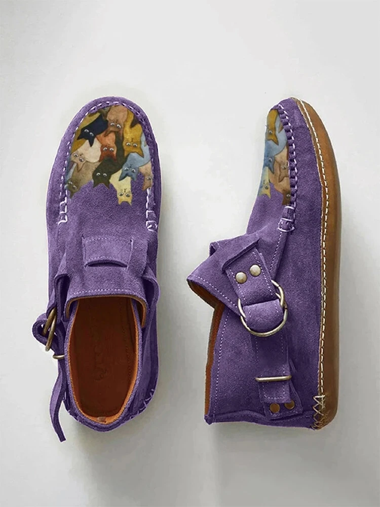 Женские удобные кожаные ботильоны Plover, повседневные ботильоны на плоской подошве, с принтом мультяшного кота, на пуговицах, фиолетового цвета, зима 2021