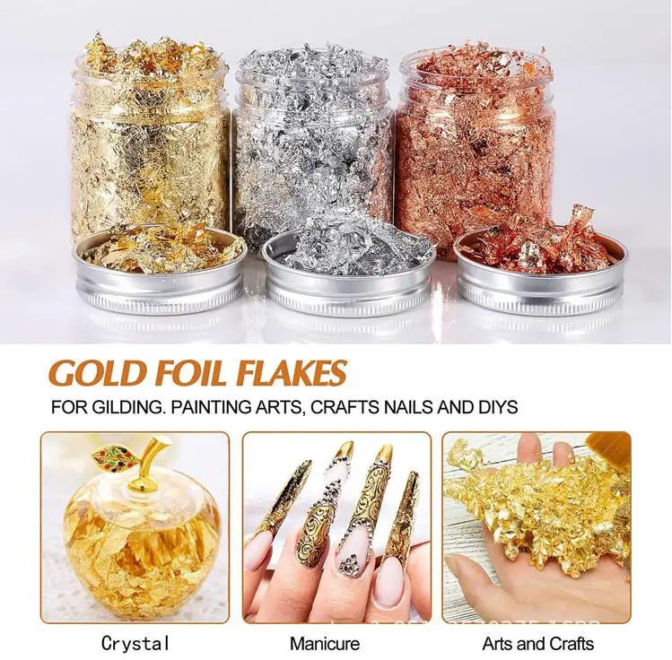 С золотыми, серебряными и медными цветами, хлопья из золотой фольги не легко выцветают и окисляются, они могут создать потрясающий Блестящий текстурированный эффект, чтобы ваши поделки выглядели особенными.