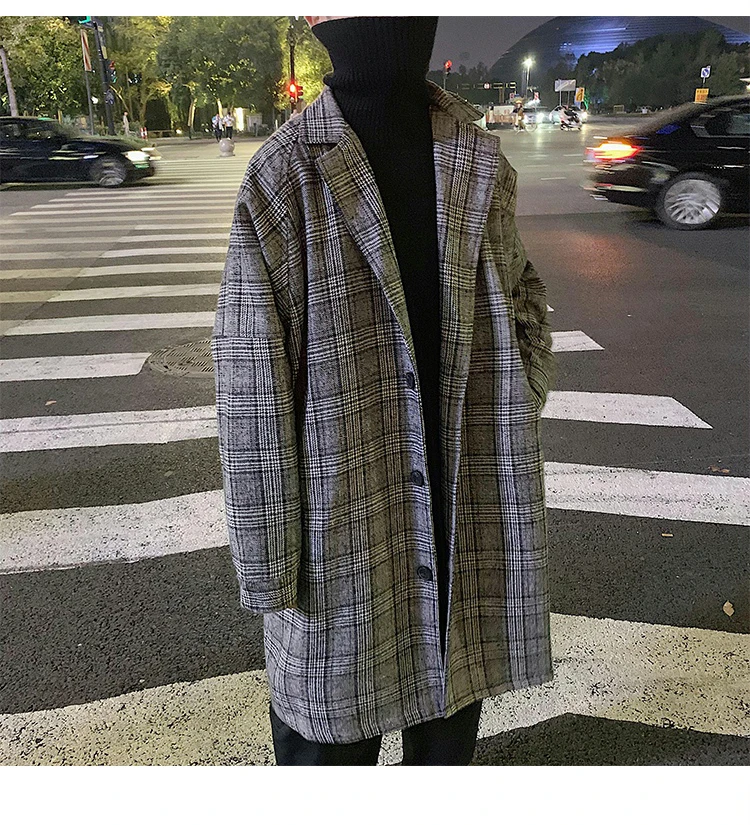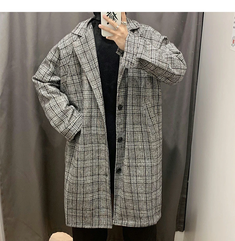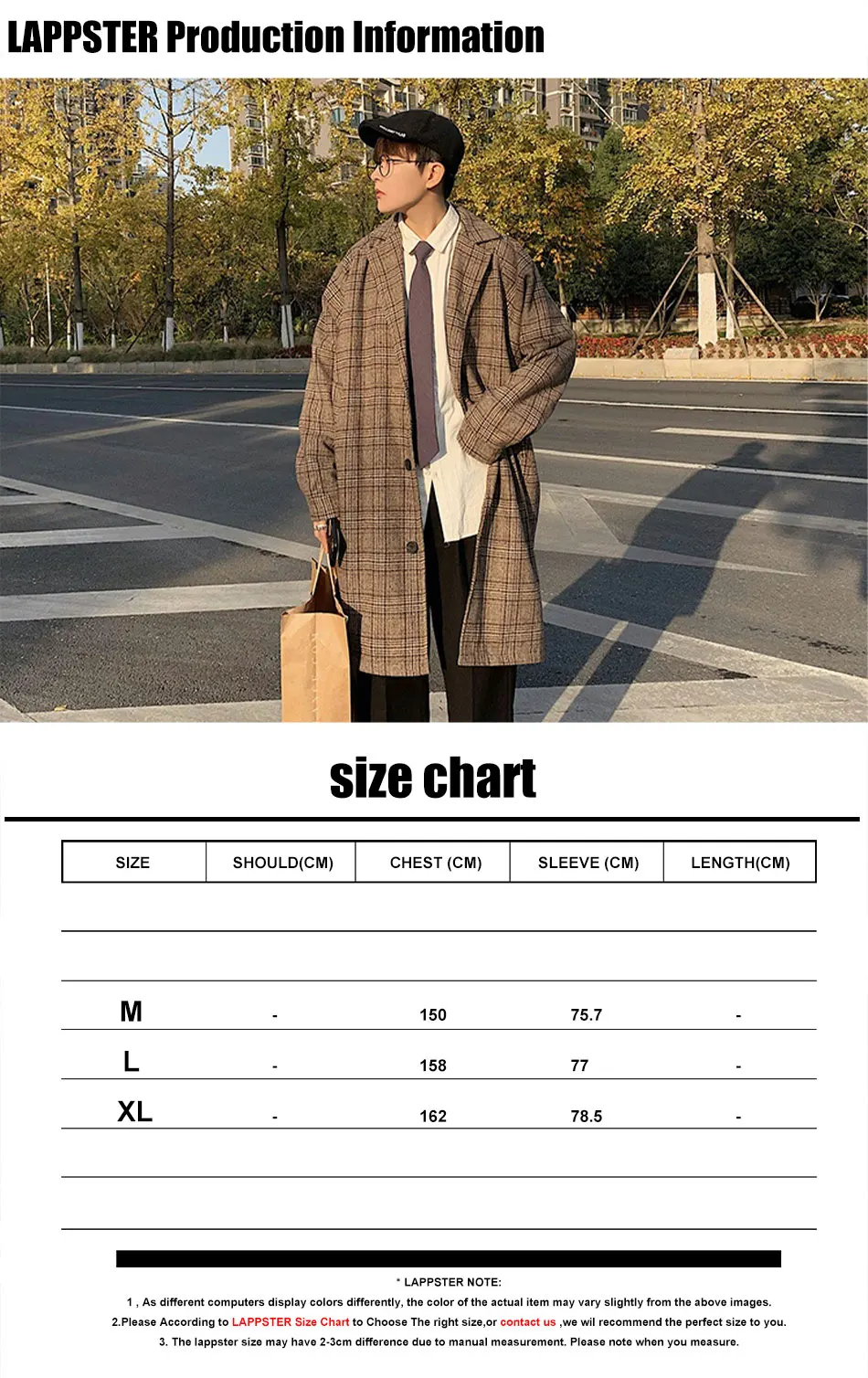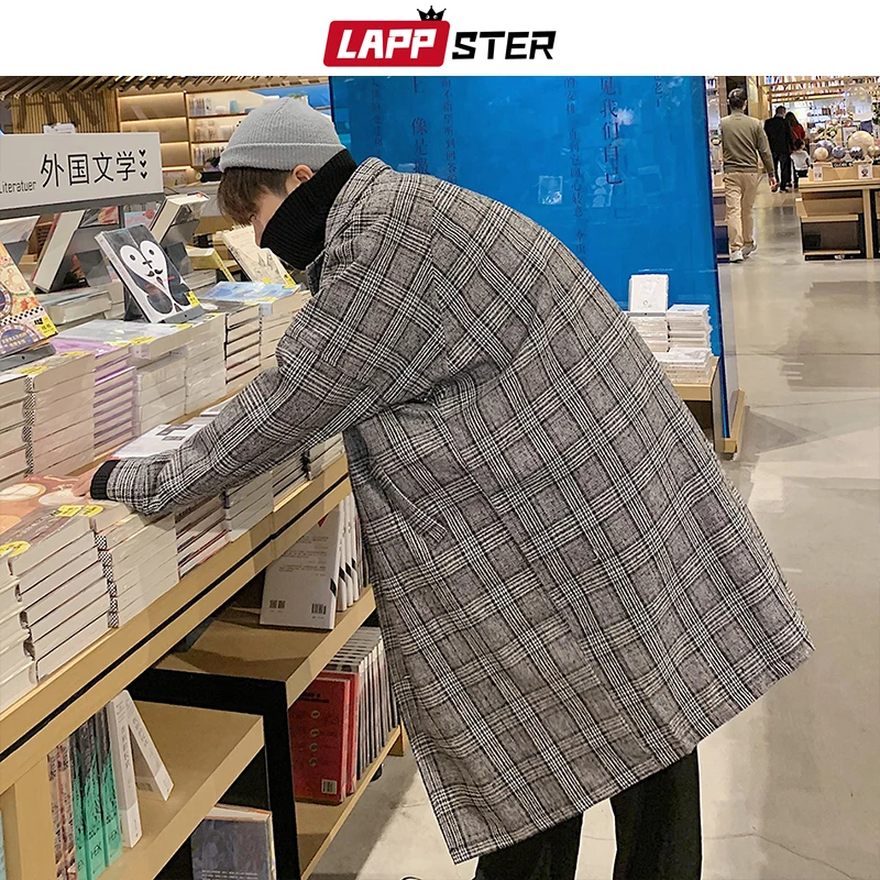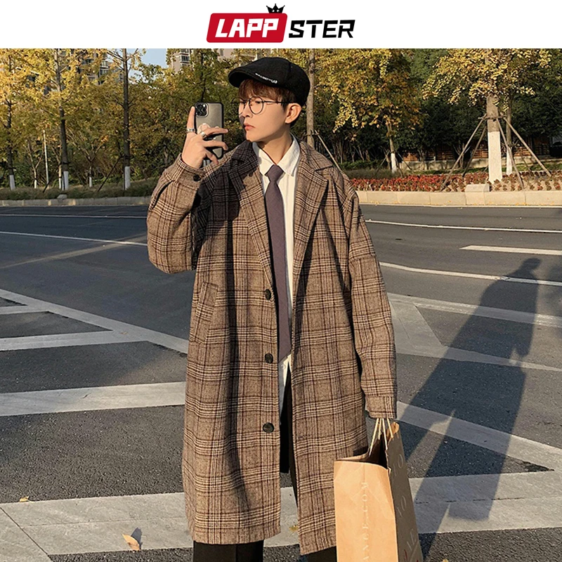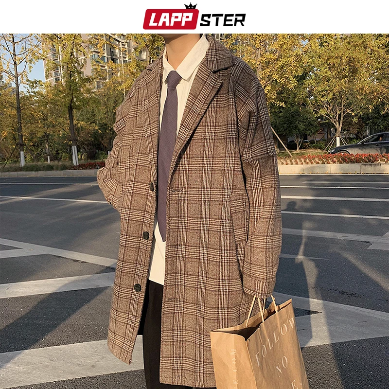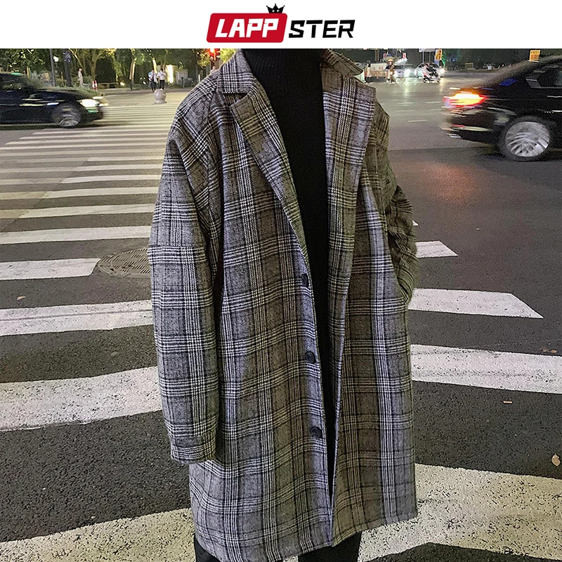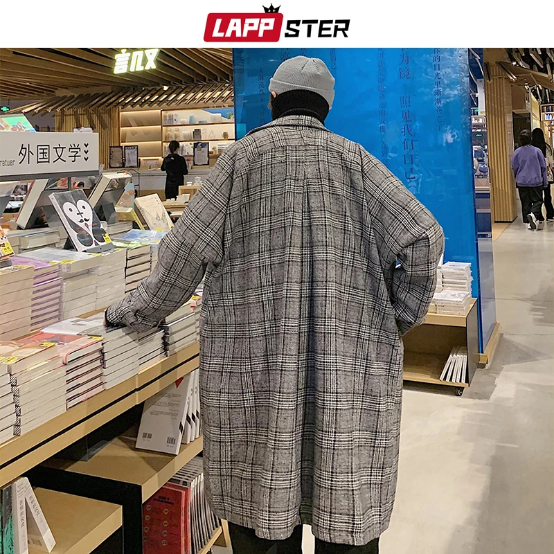 LAPPSTER мужской зимний длинный шерстяной клетчатый тренчкот 2022 Мужская винтажная серая уличная одежда куртки Мужская Harajuku Kpop модная ветровка