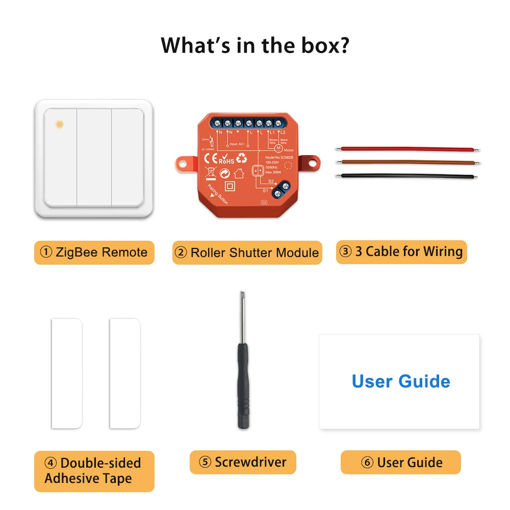 1 * ZigBee 3,0 3 комплекта дистанционного управления1 * Модуль шторного затвора ZigBee 3,03 * кабель для проводки1 * Двусторонняя лента1 * отвертка2 * Руководство пользователя на английском языке