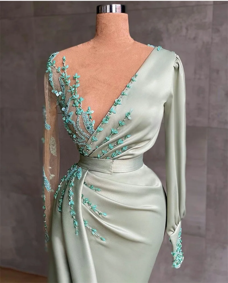 Светильник-зеленое платье с юбкой-годе для выпускного вечера, кружевное вечернее платье с аппликацией и V-образным вырезом и длинными рукавами, вечернее платье до пола по индивидуальному заказу